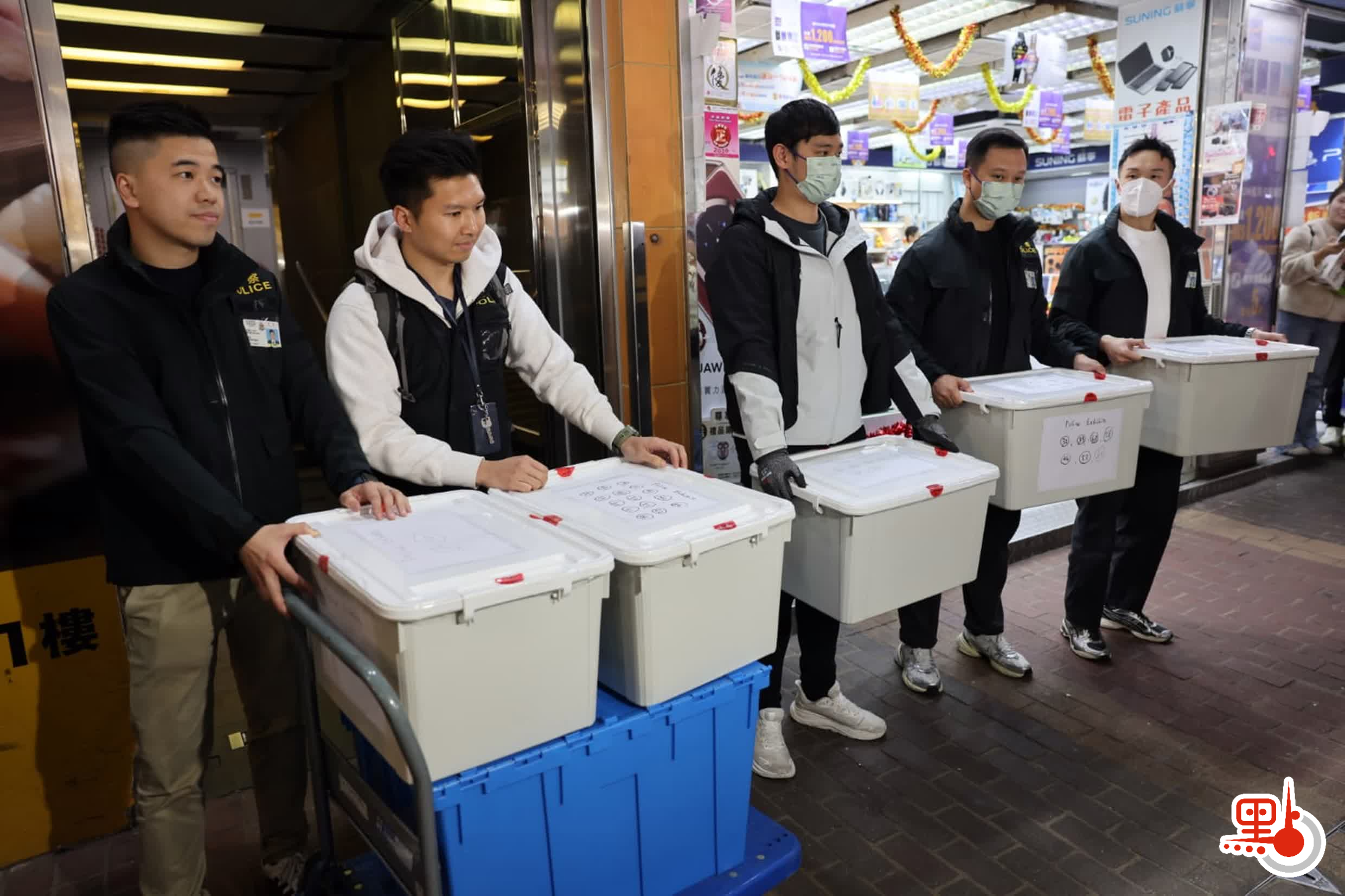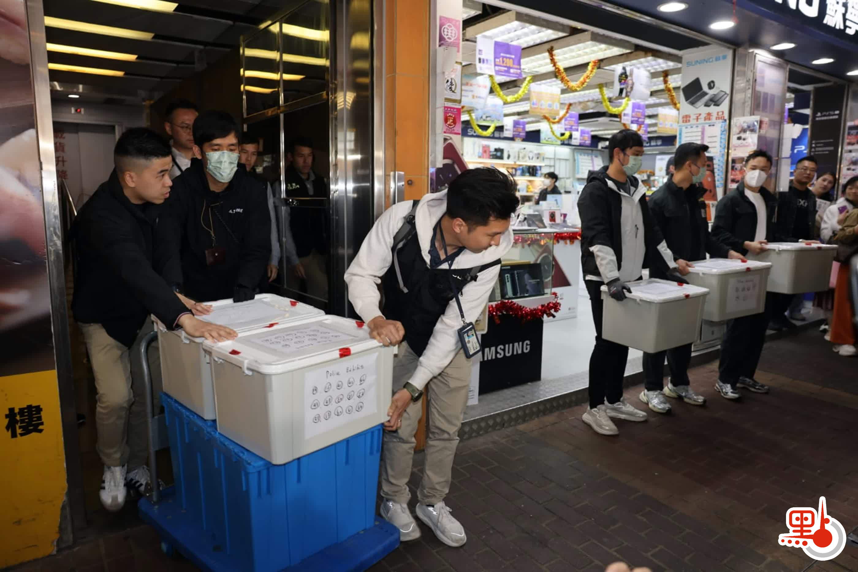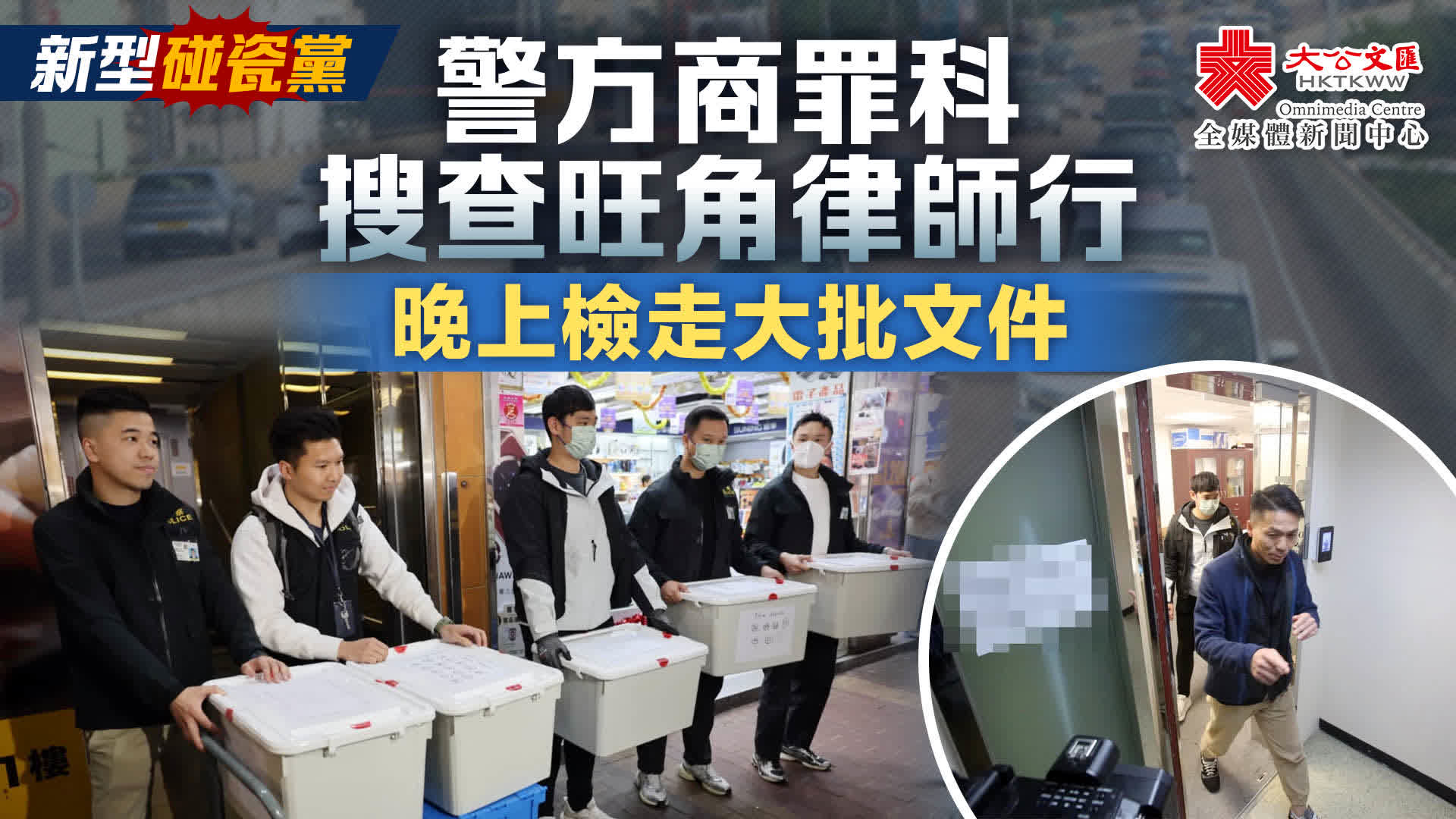 (大公文匯全媒體 記者 蕭景源)警方商業罪案調查科(商罪科)繼續針對近期揭發的「新型碰瓷黨」展開調查行動,繼上周三(4日)採取首輪執法行動,拘捕3男1女(37至69歲)包括一對夫婦及兩名醫生涉嫌串謀詐騙後,今日(9日)再搜查一間位於旺角彌敦道招商永隆銀行中心樓上的律師行,至晚上約8時半檢走至少6箱證物作進一步調查。