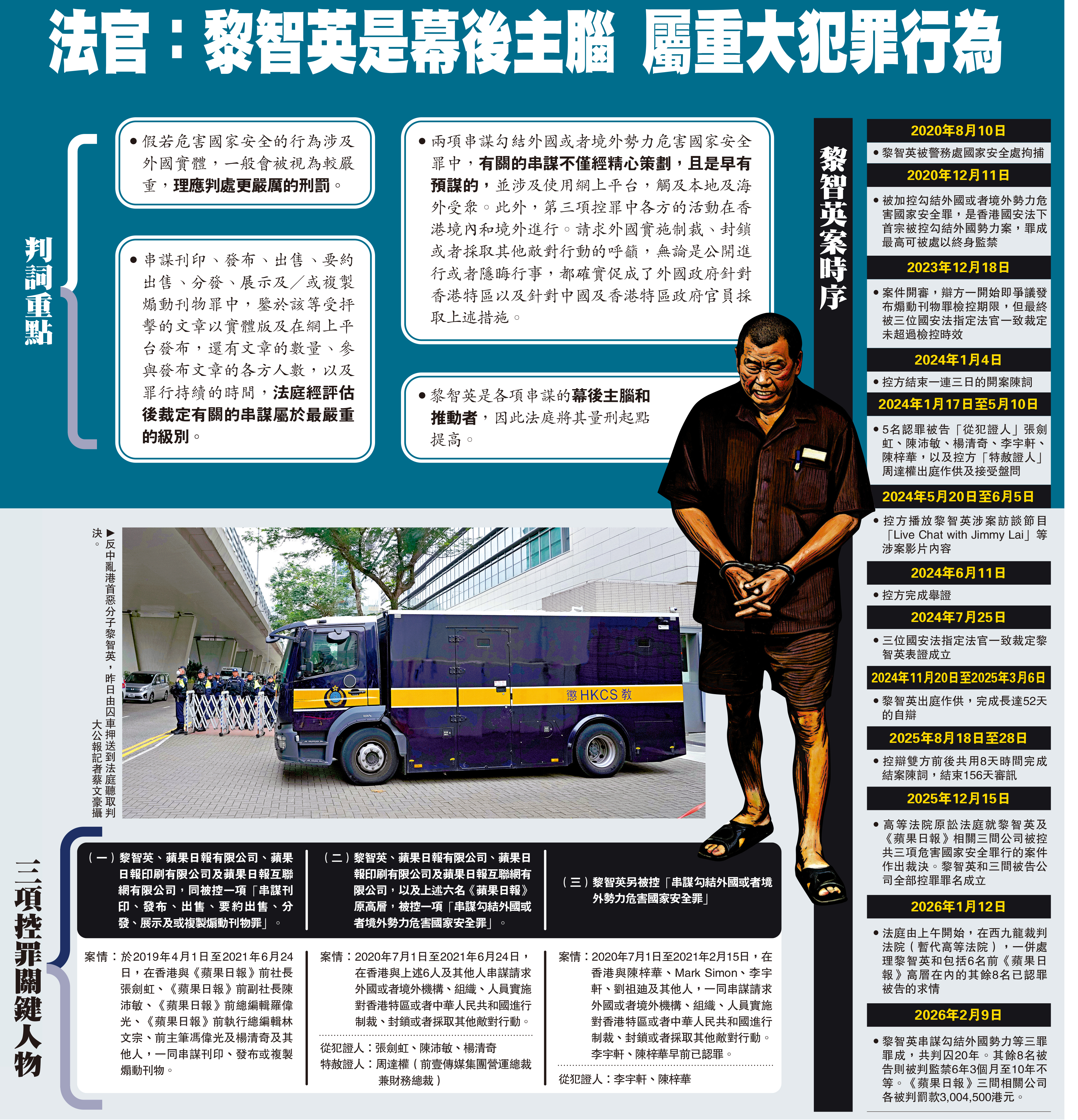 高等法院原訟法庭法官杜麗冰昨日開庭後隨即讀出各被告的判刑,並頒下判刑理由書。法庭清楚指出黎智英是本案的主腦和推手,是加重其罪責的因素,所以提高了他的量刑起點。黎智英總刑期為20年監禁,當中的18年須與他在欺詐科學園一案所判處的刑期分期執行。黎智英出庭時精神狀態穩定,聞判後平靜。