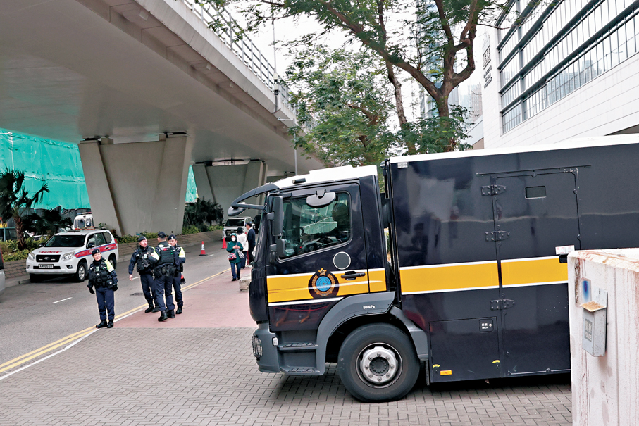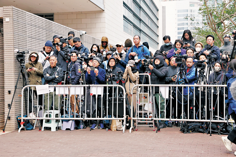 法庭早前宣布於昨日上午10時在西九龍裁判法院(暫代高等法院)開庭判刑。香港文匯報記者昨日在現場觀察發現,昨日上午8時,已有約100名市民到法庭外有序排隊輪候旁聽籌,包括支持依法嚴懲黎智英的市民,而法庭外記者區亦站滿逾百名記者。