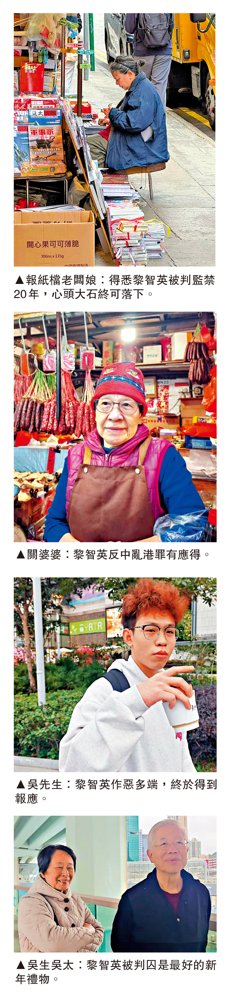 在北角經營臘味檔的關婆婆說,黎智英被判監禁20年,是「反中亂港之人的罪有應得」,2019年的社會動盪,與黎智英的扭曲事實的言論脫不了關係。她憶述黑暴期間,暴徒經常上街堵路,市民、她身邊的親友都人心惶惶,擔心危險而不敢出門,整個北角街市內近乎空無一人,她的生意也受到嚴重衝擊,「本來每日有數千元生意額,但黑暴期間無人光顧,影響生計。」