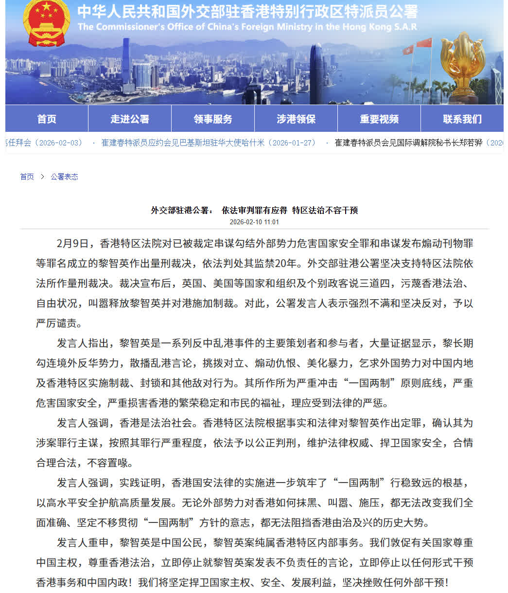 2月9日,香港特區法院對已被裁定串謀勾結外部勢力危害國家安全罪和串謀發布煽動刊物罪等罪名成立的黎智英作出量刑裁決,依法判處其監禁20年。外交部駐港公署今日(10日)在官方網站發布消息,對於美國、英國、澳大利亞等國家和歐盟官方及個別政客說三道四,污衊香港法治、自由狀況,外交公署表示強烈不滿和堅決反對,予以嚴厲譴責。以下為全文: