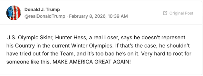 2月8日,美國總統特朗普在其社交平台真相社交發文說:「美國奧運滑雪運動員赫斯真是個徹頭徹尾的失敗者(loser),他說他不能代表他的國家參加本屆冬奧會。如果真是這樣,他就不應該去參加選拔,他能入選真是太糟糕了。很難支持這樣的人。」