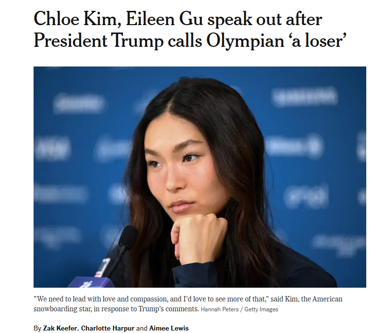 大公文匯全媒體報道,美國國內的撕裂延燒至米蘭冬奧會。日前,美國滑雪運動員赫斯在賽後的記者會上就國內的移民局暴力執法事件發聲,指「代表美國參賽而感到情緒複雜,不認同現在美國發生的事」。對於其這一言論,特朗普在社媒上發文大罵赫斯,指其為「失敗者」。2月9日,中國滑雪運動員谷愛凌接受《紐約時報》採訪時對這一鬧劇作出表態。