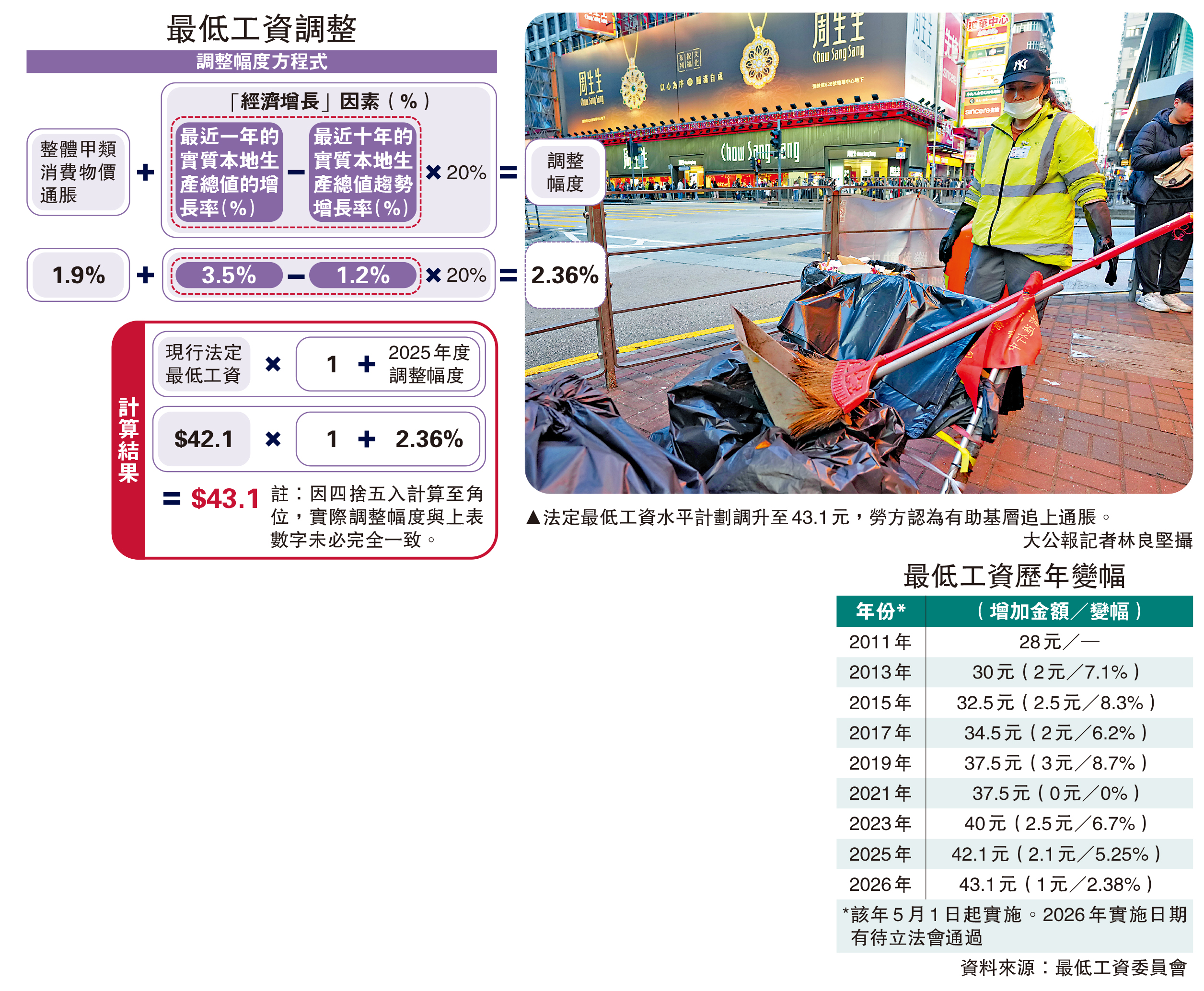政府今年首年實行法定最低工資一年一檢,並採用「消費物價通脹+經濟增長因素」方程式計算加幅,最低工資擬由每小時42.1元加至43.1元,增幅為1元或2.38%(詳見列表)。政府將於下周五(20日)刊憲,並於2月25日提交立法會,如獲立法會通過,經修訂的法定最低工資水平將於今年5月1日實施。