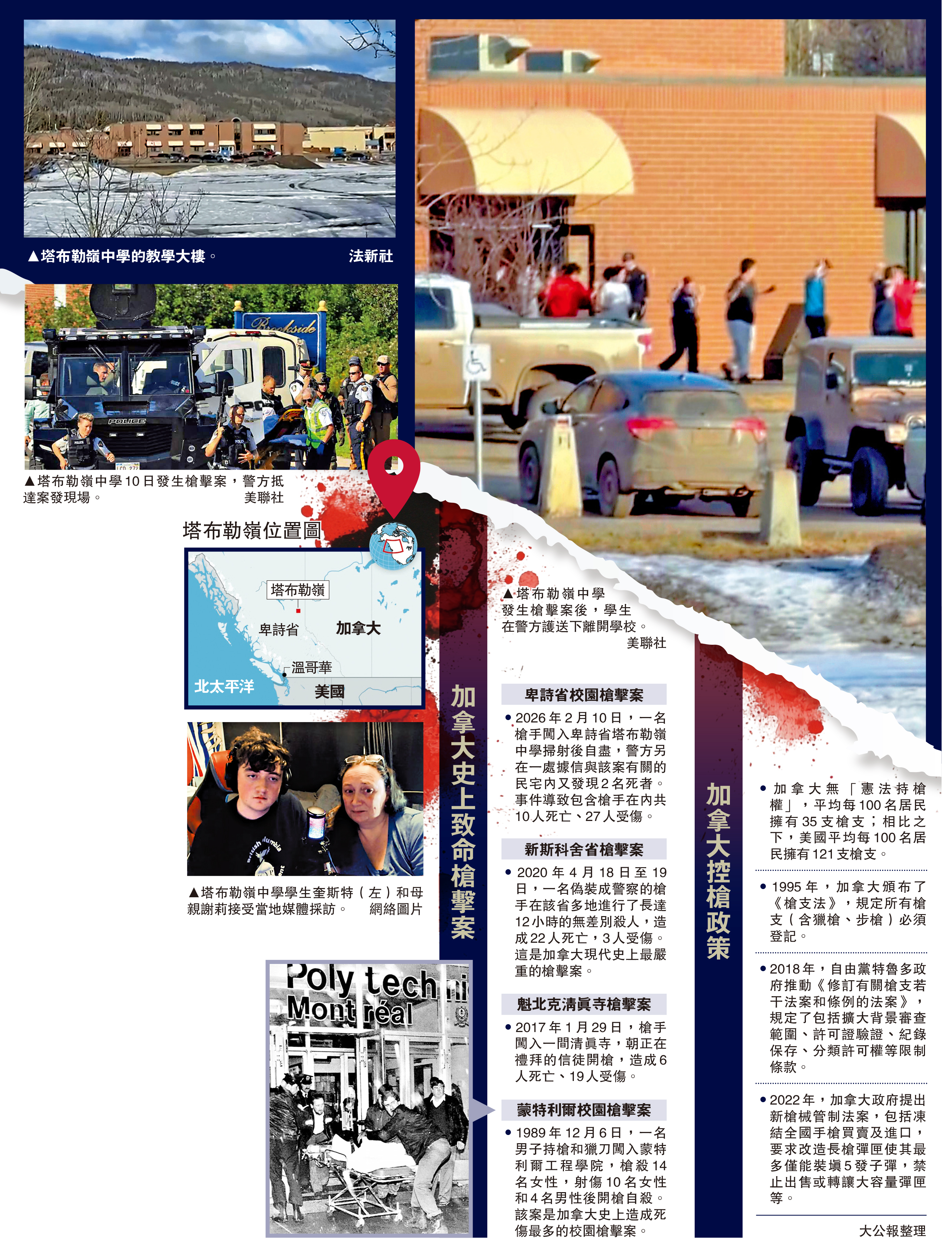 大公報綜合報道,加拿大卑詩省塔布勒嶺10日發生一起嚴重校園槍擊事件,造成包括槍手在內的10人死亡、至少27人受傷。警方初步判定槍手死因是自殺,正調查其作案動機。這起悲劇成為加拿大自1989年以來最嚴重的校園槍擊事件。加拿大總理卡尼取消外訪行程,並宣布全國降半旗一周誌哀。媒體評論稱,加拿大實施較為嚴格的槍支管控政策,此類大規模槍擊事件在該國相當少見。