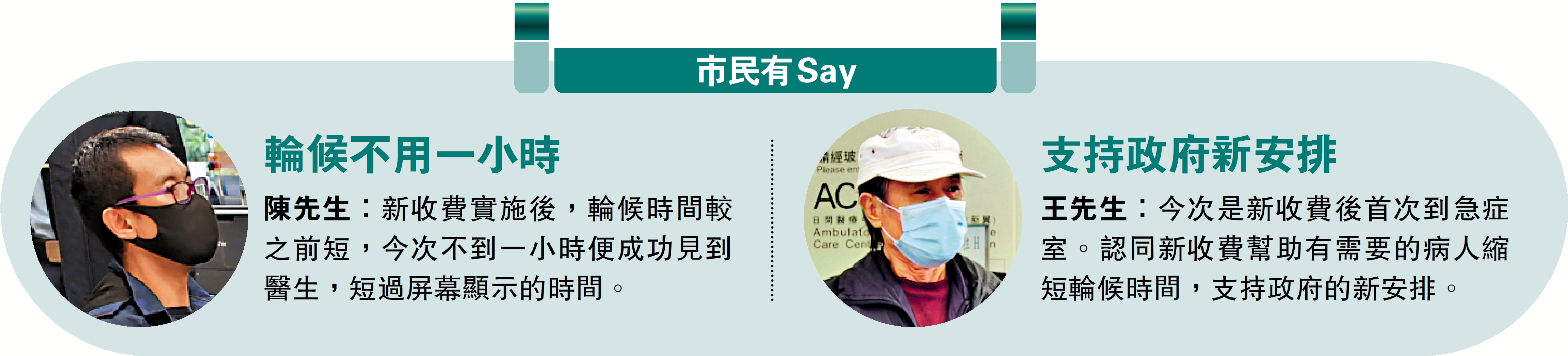 王先生因扭傷,到急症室求診,是收費改革後首次到急症室,輪候約2小時。他說,與屏幕顯示的預計平均輪候時間相近,較新收費實行前需時縮短約2成。他認同新收費幫助了有需要的病人縮短輪候時間,「能節省輪候時間,及時就醫最重要。」他說,家中有備些常用藥,預防感冒等輕微病徵;若遇上自己處理不了的病症,才會到醫院求診。