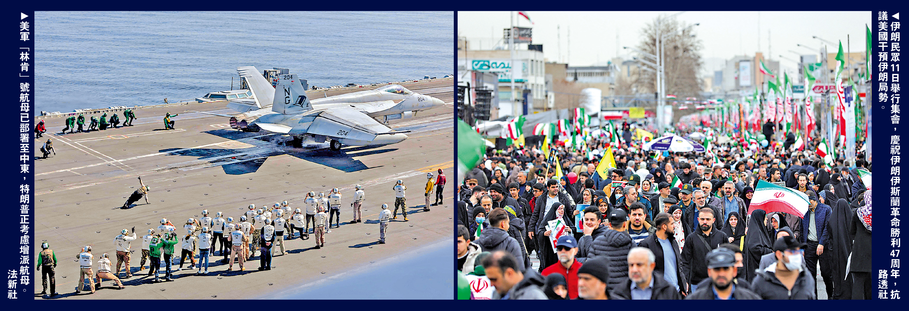 大公報綜合報道,美國總統特朗普10日威脅稱,他正在考慮向中東派遣第二個航母戰鬥群,以準備在與伊朗談判失敗時採取軍事行動。他聲稱,任何協議都必須涵蓋伊朗的核計劃和彈道導彈庫存。伊朗當局11日表示,伊朗不尋求核武器,但不會在「過度要求」面前退讓;導彈能力並不在與美國談判的範圍內。衛星圖像顯示,美軍已將部署在卡塔爾的「愛國者」導彈裝載到移動發射車上。伊朗外長阿拉格齊表示,伊朗已做好戰爭與外交「兩手準備」。