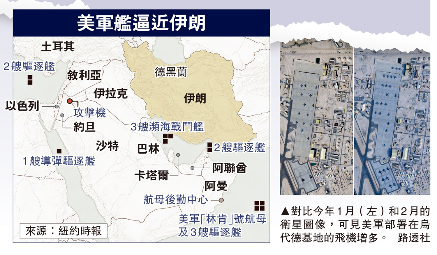 美伊6日在阿曼舉行核問題間接談判,未取得任何突破。儘管雙方均表示願意繼續談判,但爆發軍事衝突的風險依然存在。路透社10日報道稱,對比今年1月和2月初拍攝的衛星圖像,可以看到美軍在中東地區部署的飛機和其他軍事裝備有所增加。尤其值得注意的是,美軍將部署在卡塔爾烏代德基地的「愛國者」導彈裝載到移動發射車上,意味着它們可以迅速發動打擊,或在遭到打擊時迅速轉移。報道指出,這表明隨着美伊緊張局勢升級,爆發衝突的風險進一步上升。