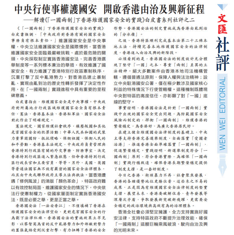 文匯社評|敢於鬥爭善於鬥爭築牢國安屏障 書寫香港繁榮發展新篇章——解讀《「一國兩制」下香港維護國家安全的實踐》白皮書系列社評之一