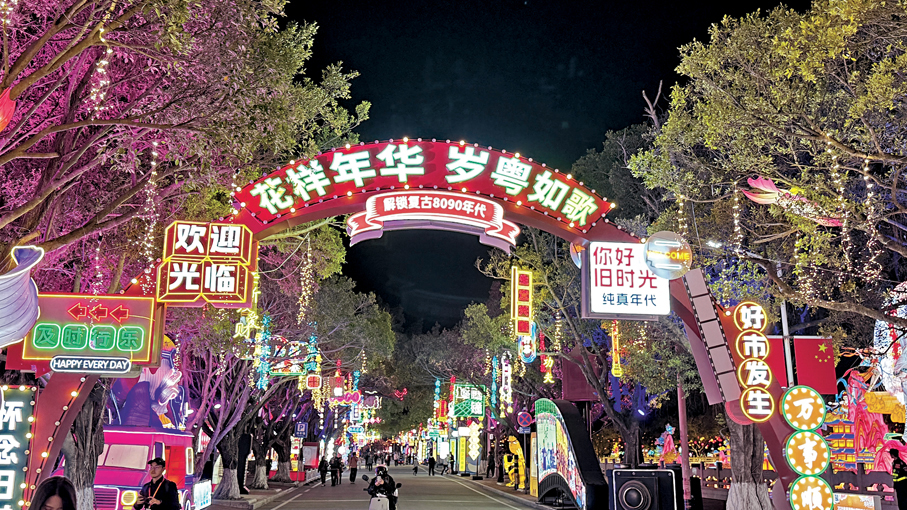(香港文匯報記者 黃寶儀、帥誠 廣州報道)《偏偏喜歡你》《月半小夜曲》《光輝歲月》的光影「旋律」飄蕩在半空,「李小龍耍雙節棍」「包租婆追殺包租公」「黃家駒卡帶」「旺角夜色」等各種經典港片名場面「打卡位」在園區道路兩旁迎客,五光十色的霓虹燈營造出活力四射的氛圍,讓觀眾一秒「穿越」回上世紀八九十年代……2026年大灣區燈會10日晚亮燈迎客,港風「回憶殺」等獨具灣區特色的設計成為燈會一大亮點,吸引了不少市民遊客駐足欣賞、打卡拍照。