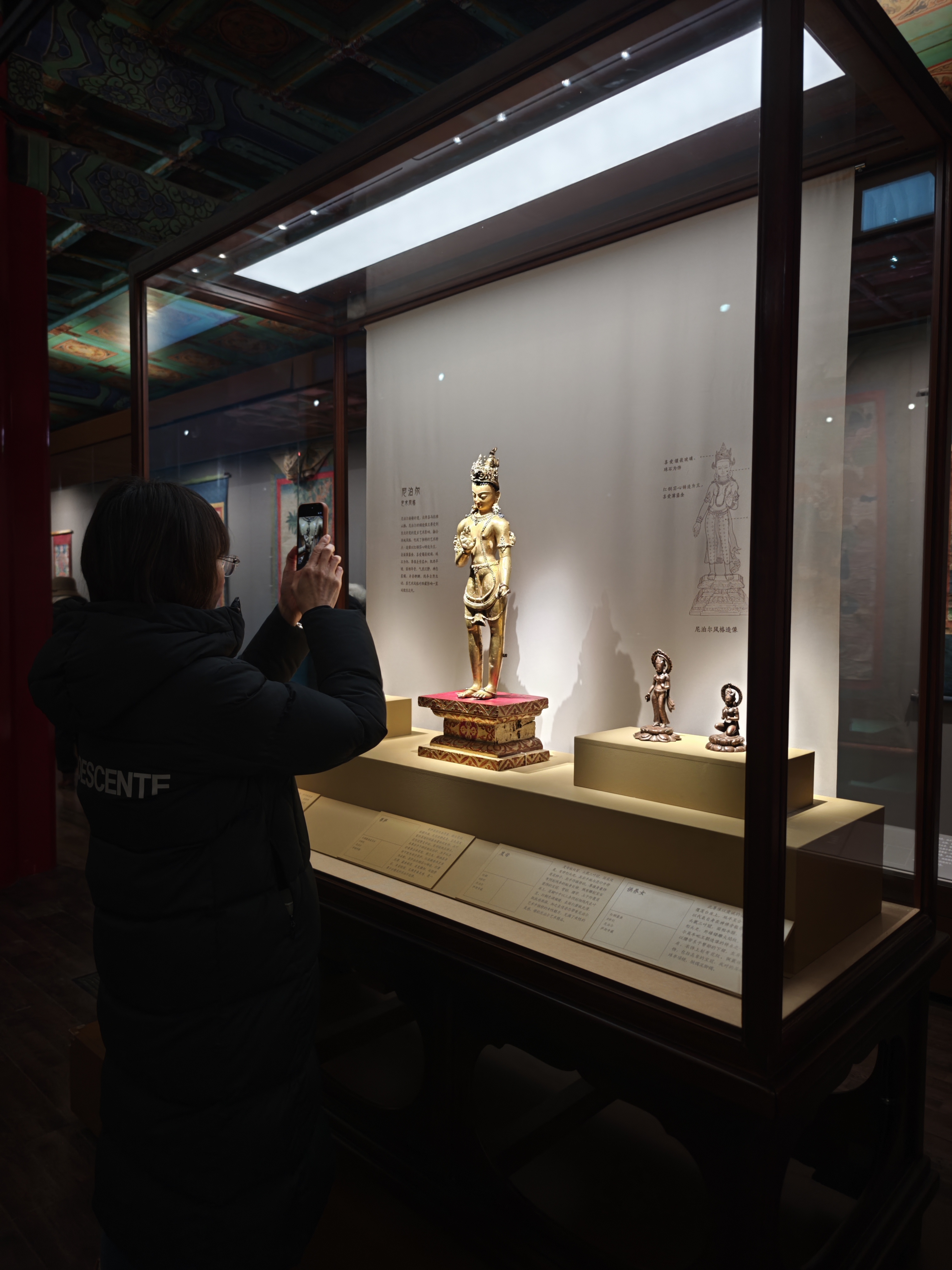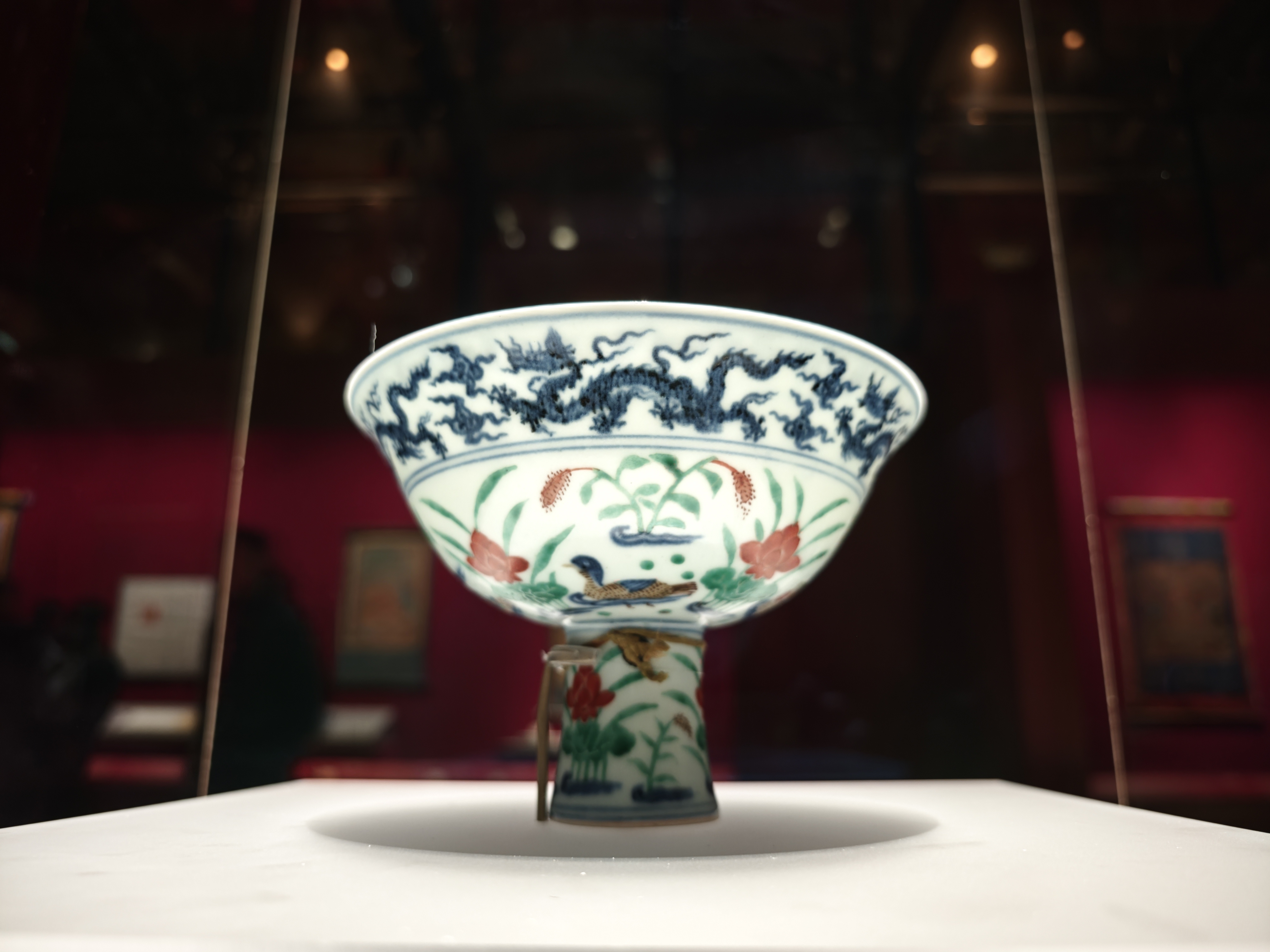 除了收藏於薩迦寺的精美唐卡、菩薩造像和貝葉經外,展廳內一件青花五彩滿池嬌圖靶碗吸引了很多觀眾駐足。這件文物出自景德鎮,藏於薩迦寺。碗外口沿下繪寬帶青花雲龍紋,外腹壁及外足,內底滿繪五彩「滿池嬌」圖。「滿池嬌」一詞出現於元代柯九思《草堂雅集·宮詞十五首其十二》中:「天曆間,御衣多為池塘小景,名曰『滿池嬌』。」這種紋飾常見於元青花瓷器中,明代則繼續沿用。碗內口沿書青花藏文六時吉祥咒一周。足內有青花「宣德年制」四字楷書款。據介紹,此碗施釉工藝出現了釉下青花與釉上五彩結合,拼湊成完整圖案的技法,即鬥彩工藝的雛形。