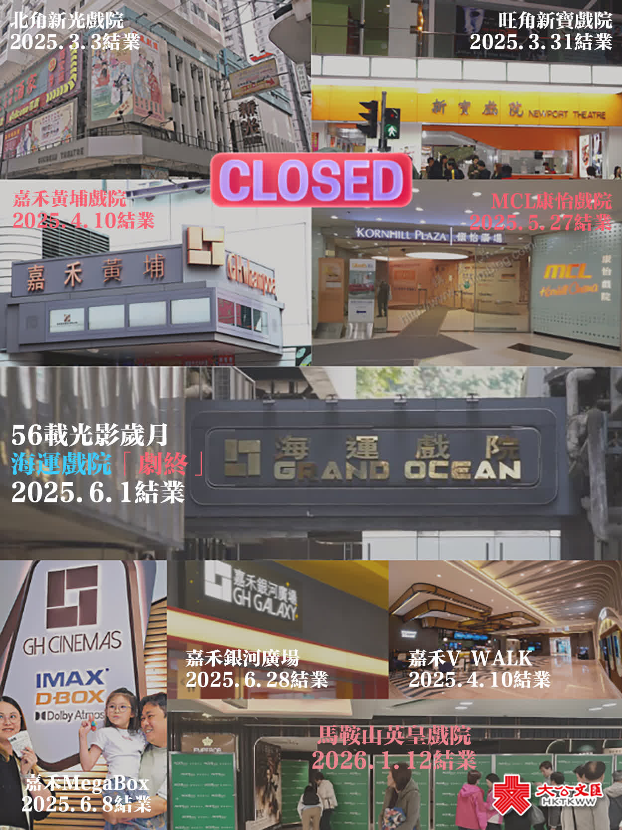 一個時代的落幕尤為令人唏噓:嘉禾院線於2025年6月徹底停止在港經營。其旗下的海運、MegaBox、黃埔、大埔及奧海城the sky等據點,或關門謝客,或轉手他人。