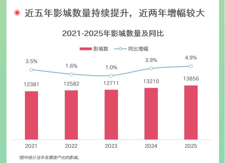 與香港戲院的收縮形成對比,內地市場在數據上呈現逆勢增長。根據貓眼研究院發布的《2025中國電影市場數據洞察》,2025年內地影城數量淨增646家,同比增幅4.9%,增量主要下沉至三四五線城市。