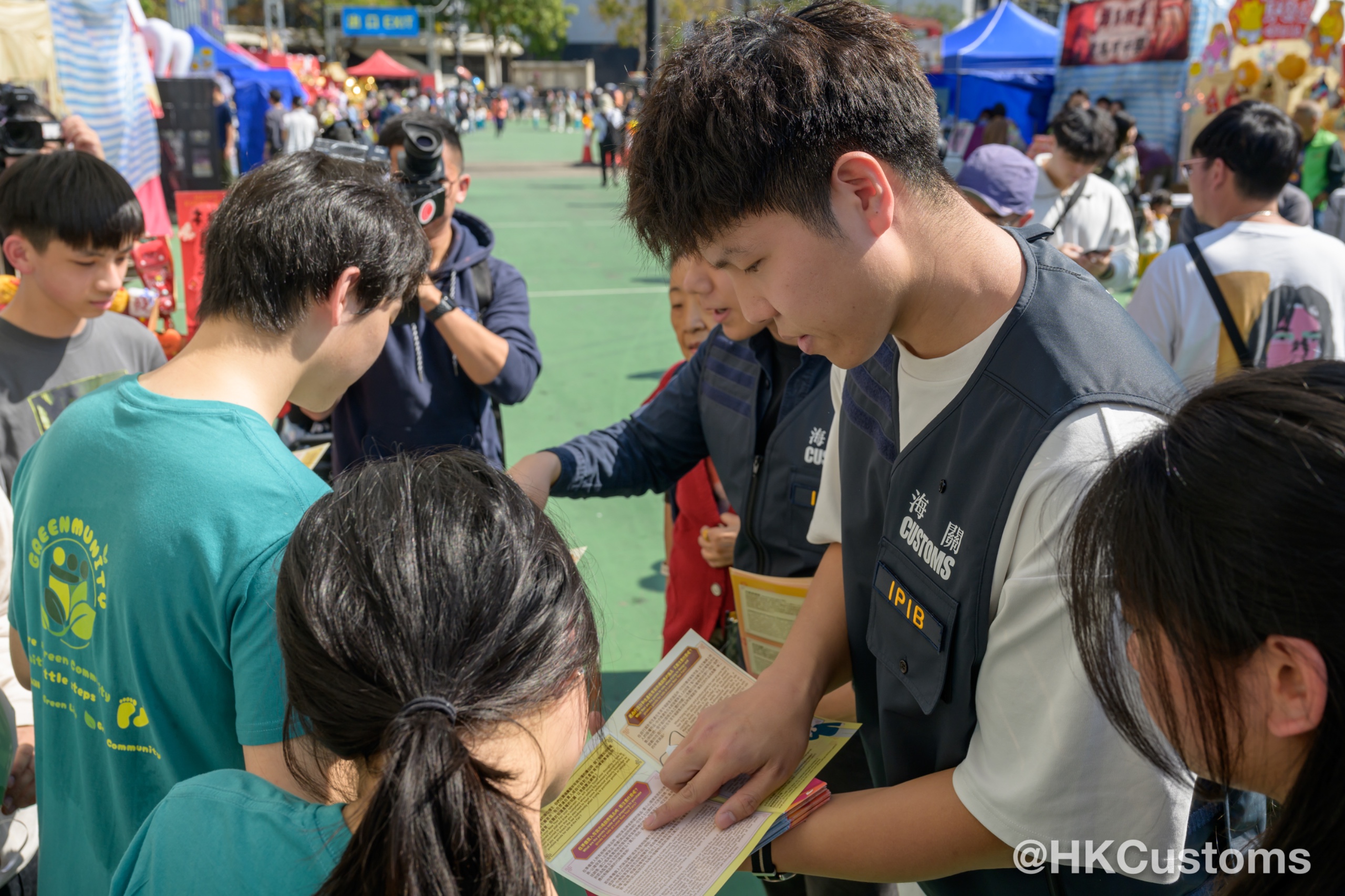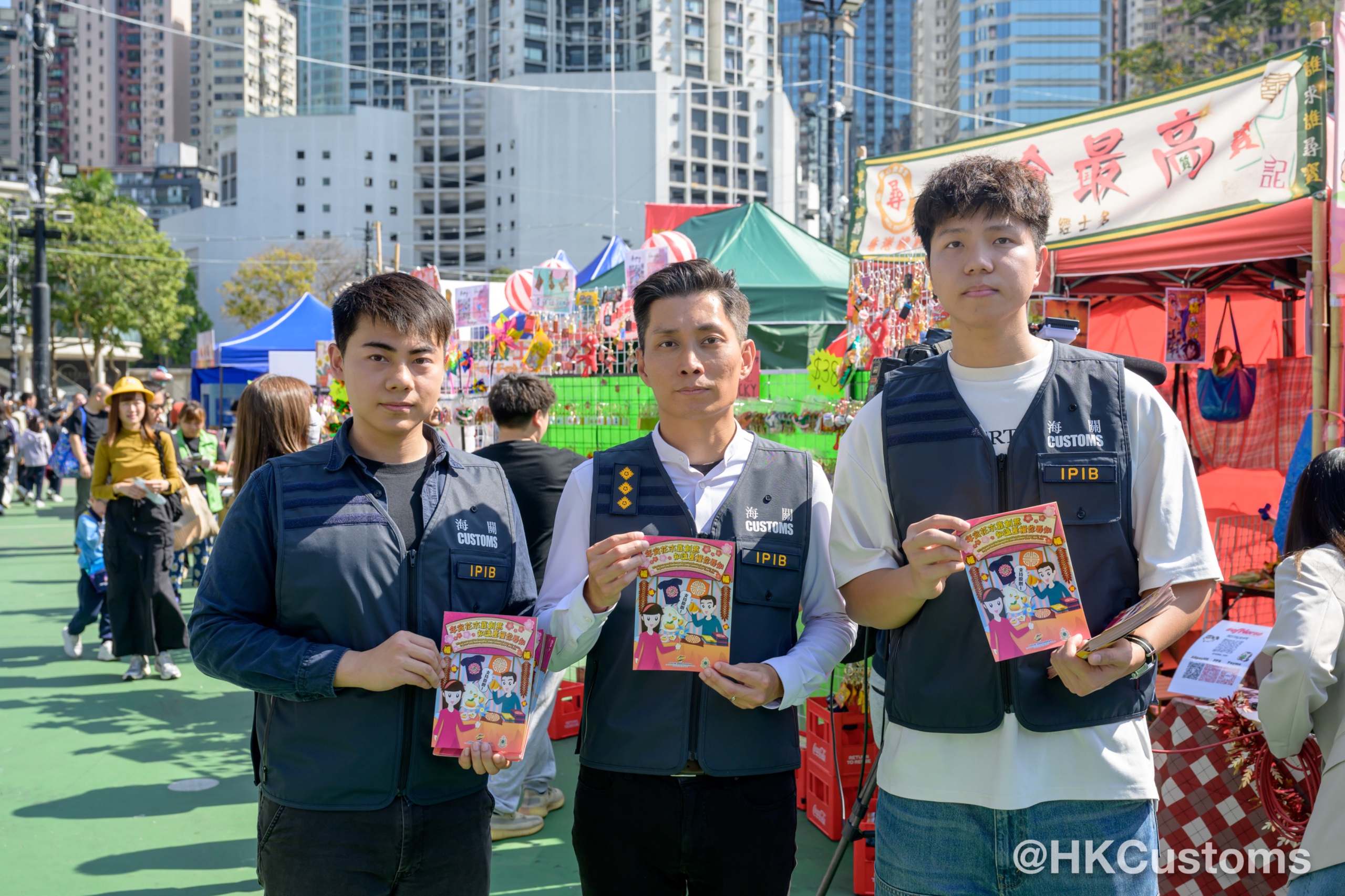 香港海關人員二月十一日在多個年宵市場向檔主派發傳單,呼籲他們切勿售賣侵權物品。