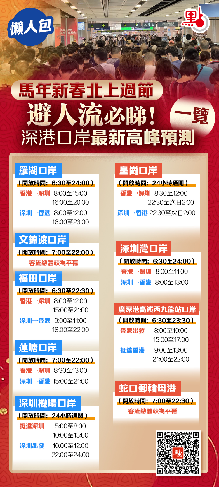 大文整理了北上過關懶人包,包括各深港口岸開放時間及高峰預測,掃描二維碼即可查看。入境處建議市民旅客應預早計劃行程,避免選擇在繁忙時段過關,過關時記得帶備有效身份證明文件或有效旅行證件。