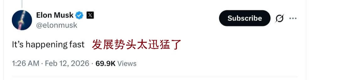 字節跳動視頻模型Seedance 2.0同樣在海外爆火。馬斯克在其社交平台X轉發評論Seedance 2.0相關推文,並表示模型發展速度太快(It's happening fast)。
