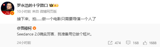 值得注意的是,知名導演賈樟柯發文稱:Seedance 2.0確實厲害,我準備用它做個短片。對此,羅永浩表示,「接下來,拍……做一個電影只需要導演一個人了。」
