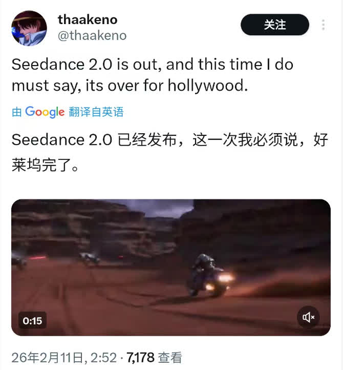 多位美國導演在社交平台X(原推特)分享了自己使用Seedance 2.0製作短片的感受,並發出了「好萊塢要完蛋了」的感嘆。