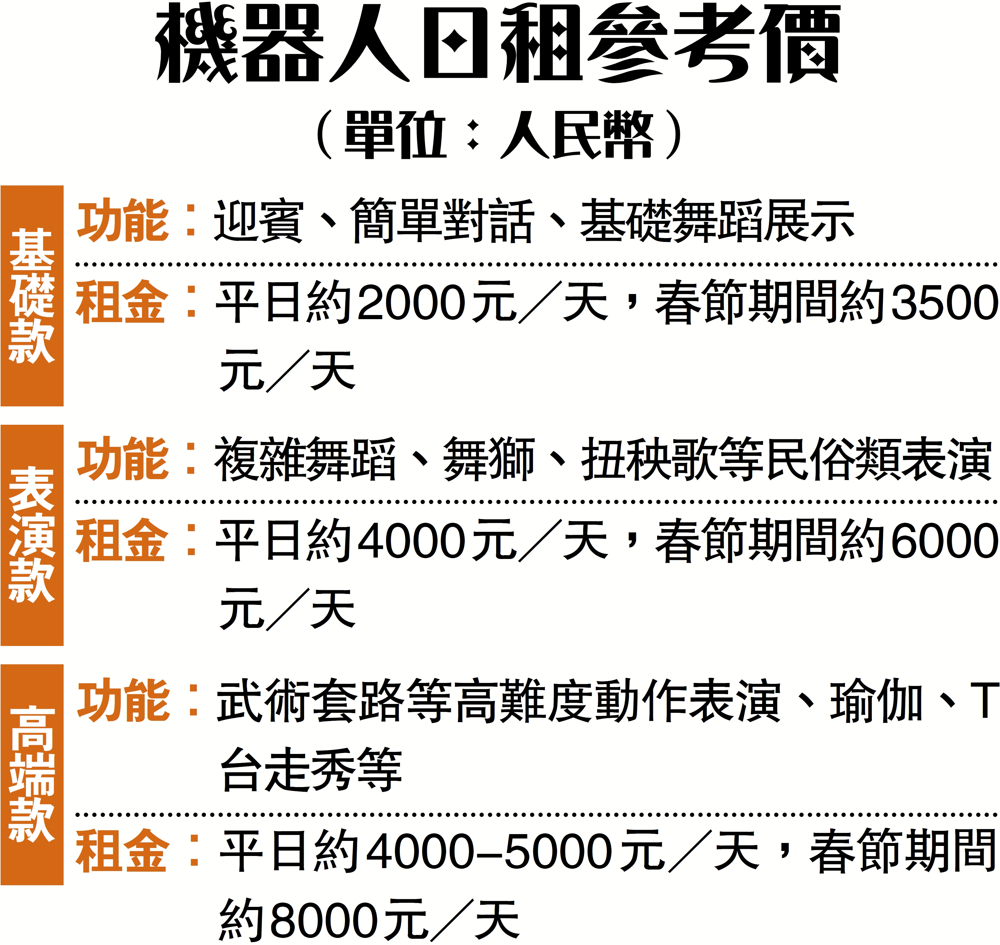 租金方面,一台四足機器狗日租300元;主流的人形機器人例如智元靈犀X2青春版,日租3599元起,可完成跳舞、太極等表演。此外,部分定製型高端方案,整合了多款機器人型號,會以「組團」形式表演《機器人時裝秀》《舞林大會》等一系列節目,單日租金達近10萬元。