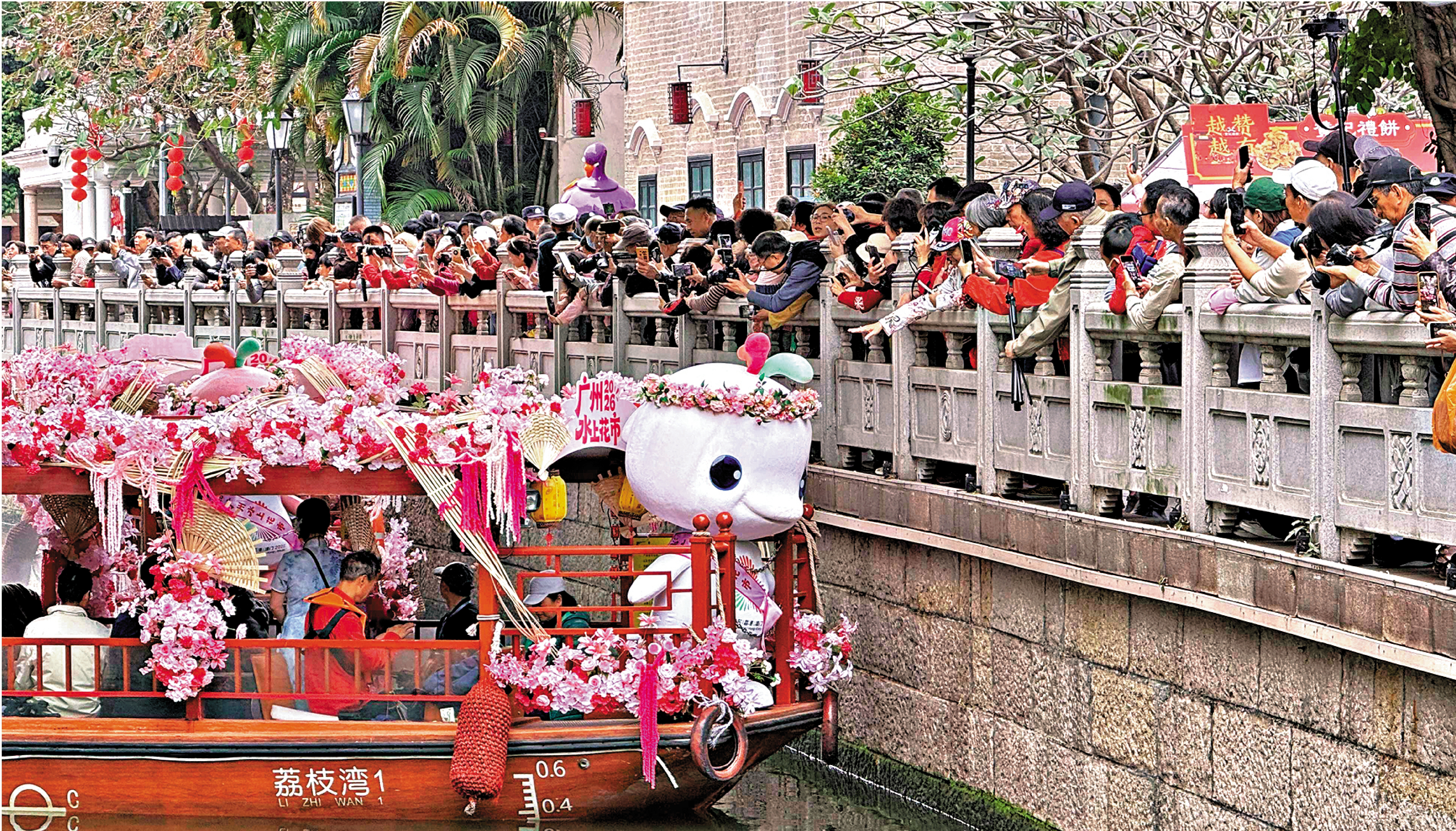 (大公報記者 盧靜怡、黃寶儀 廣州報道)「So beautiful!」廣州荔枝灣涌上花船披紅掛粉、年花錦簇,一名歐洲遊客邊拍照邊感嘆。12日,廣州最具嶺南特色的水上花市在荔灣永慶坊旅遊區開鑼,吸引大批市民遊客與海外旅客專程前來「行花街」、打卡最地道的嶺南春節。在水上花市,「灣區頂流」─「大灣雞」頭戴花環乘船賣花,與岸上遊客互動賣萌,成為打卡焦點。今年廣州水上花市聯動嶺南花卉市場,將民俗活動與市場產銷相結合,人們在活動現場便可買到和專業市場同品、同質的各式年花。