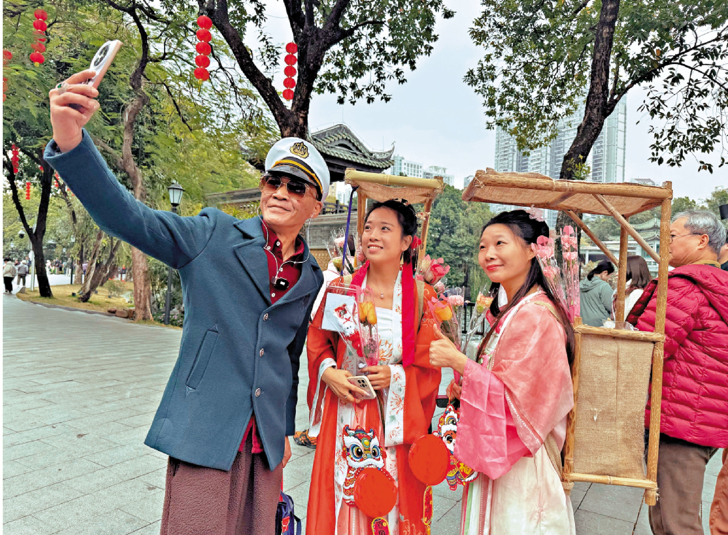 「我的粵語是跟着祖籍廣東的女友學的,覺得大灣區分外親切。」Jules說,他們來中國第一站先到了香港,四處閒逛,品嘗各式美食。然後第二站就是來到廣州。「一路上我都可以用粵語溝通,感覺很方便。」他還分享稱,自己來自法國里昂,而「里昂」在法語中意為「獅子」,所以在水上花市看到舞獅表演時,他覺得分外有緣,也被濃厚的中國文化氛圍深深吸引。法國女生Lisa是第一次到中國。她表示,自己和朋友特意選擇農曆春節來大灣區,會逗留十多天,並計劃帶一些肉脯和點心回法國與親友分享。