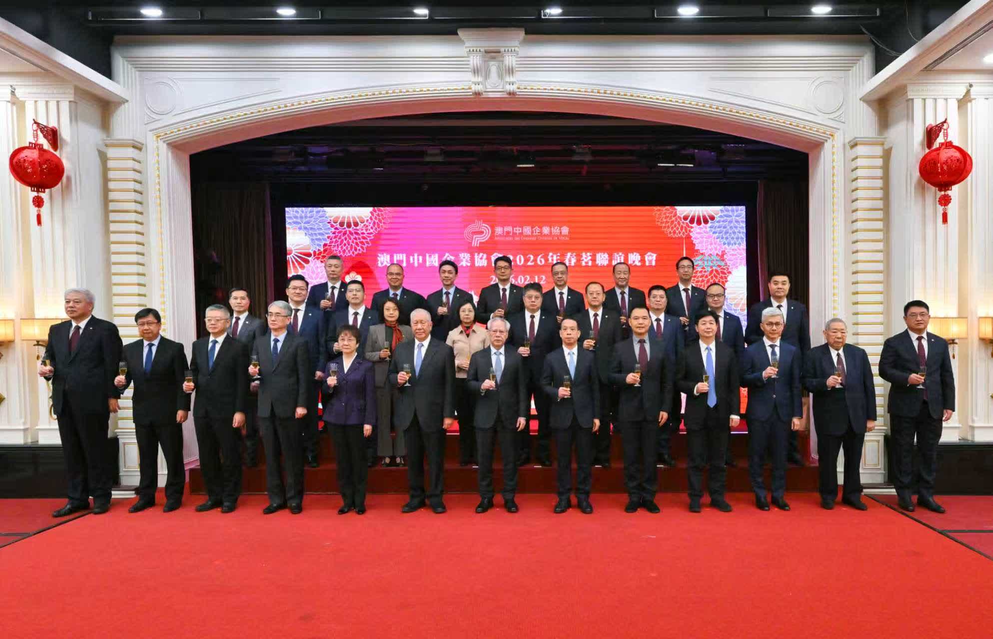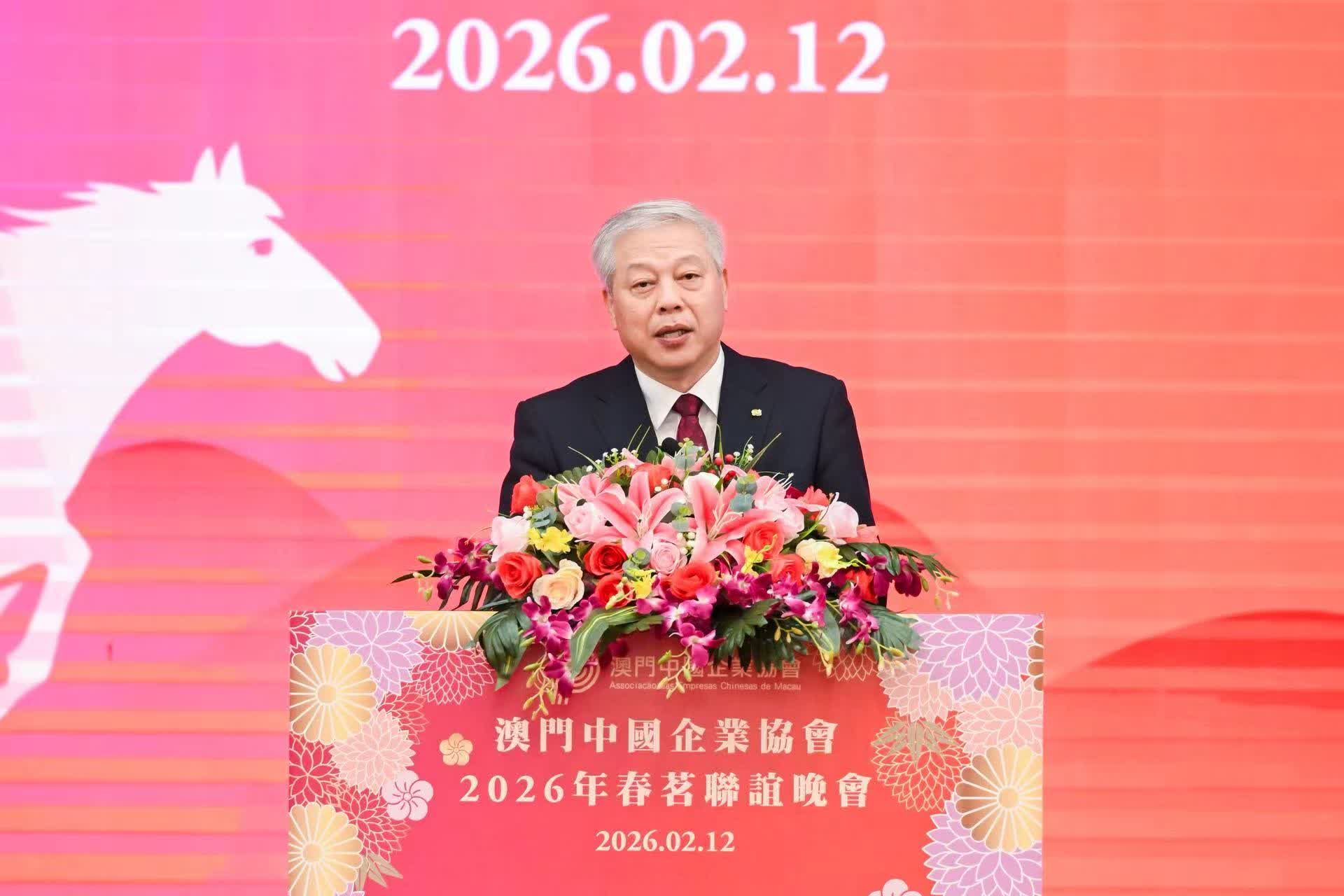 澳門中國企業協會昨(12)日假萬豪軒舉辦2026年春茗聯誼晚會。澳門特別行政區行政長官岑浩輝,全國政協副主席何厚鏵,中央人民政府駐澳門聯絡辦公室副主任黃柳權,外交部駐澳門特派員公署特派員卞立新,中國人民解放軍駐澳門部隊副司令員戴勁松,澳門特別行政區立法會主席張永春,中央人民政府駐澳門聯絡辦公室副主任呂玉印、張應傑,澳門特別行政區政府經濟財政司司長戴建業、運輸工務司司長譚偉文,澳門中華總商會會長崔世昌,以及澳門社會各界代表人士出席活動。