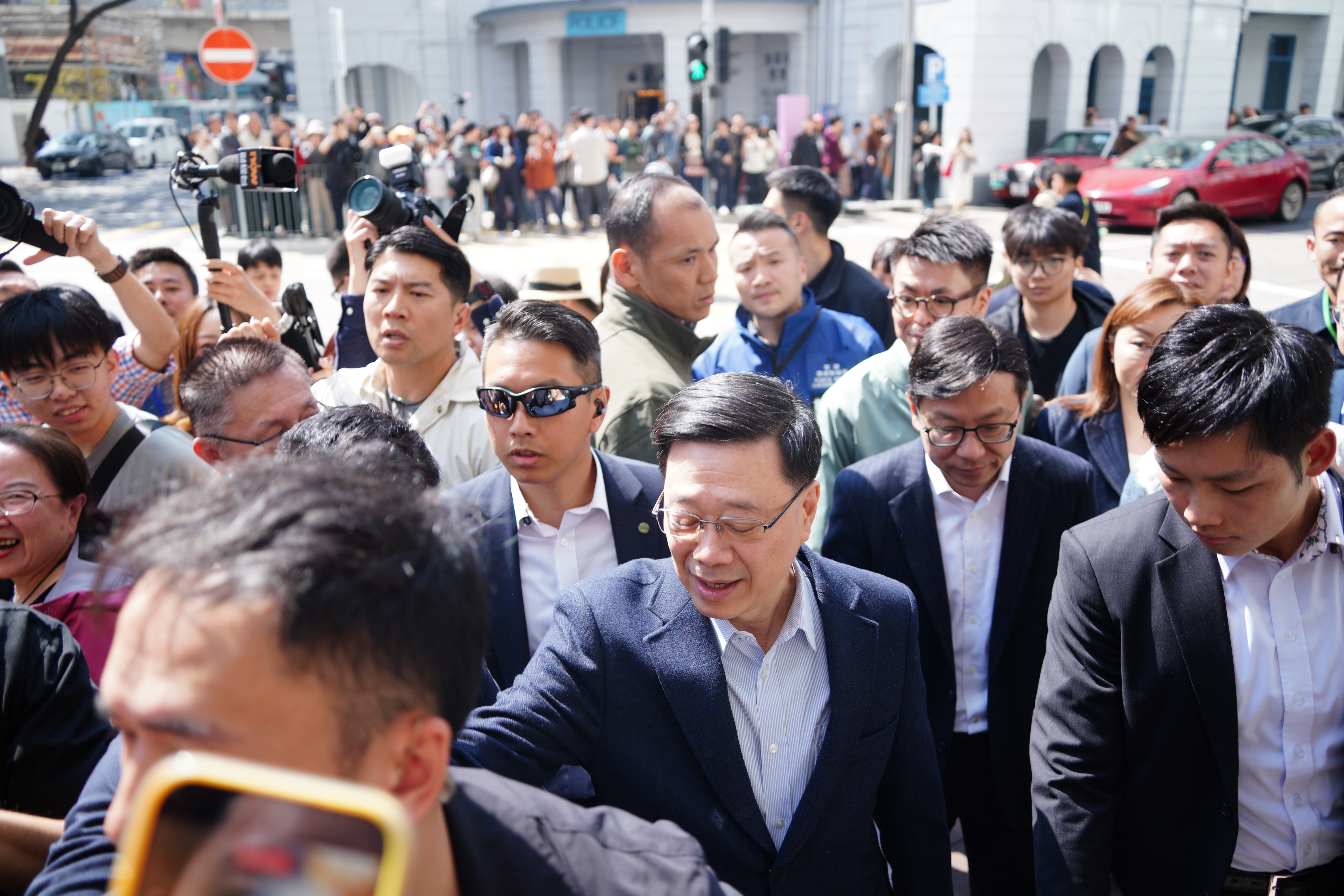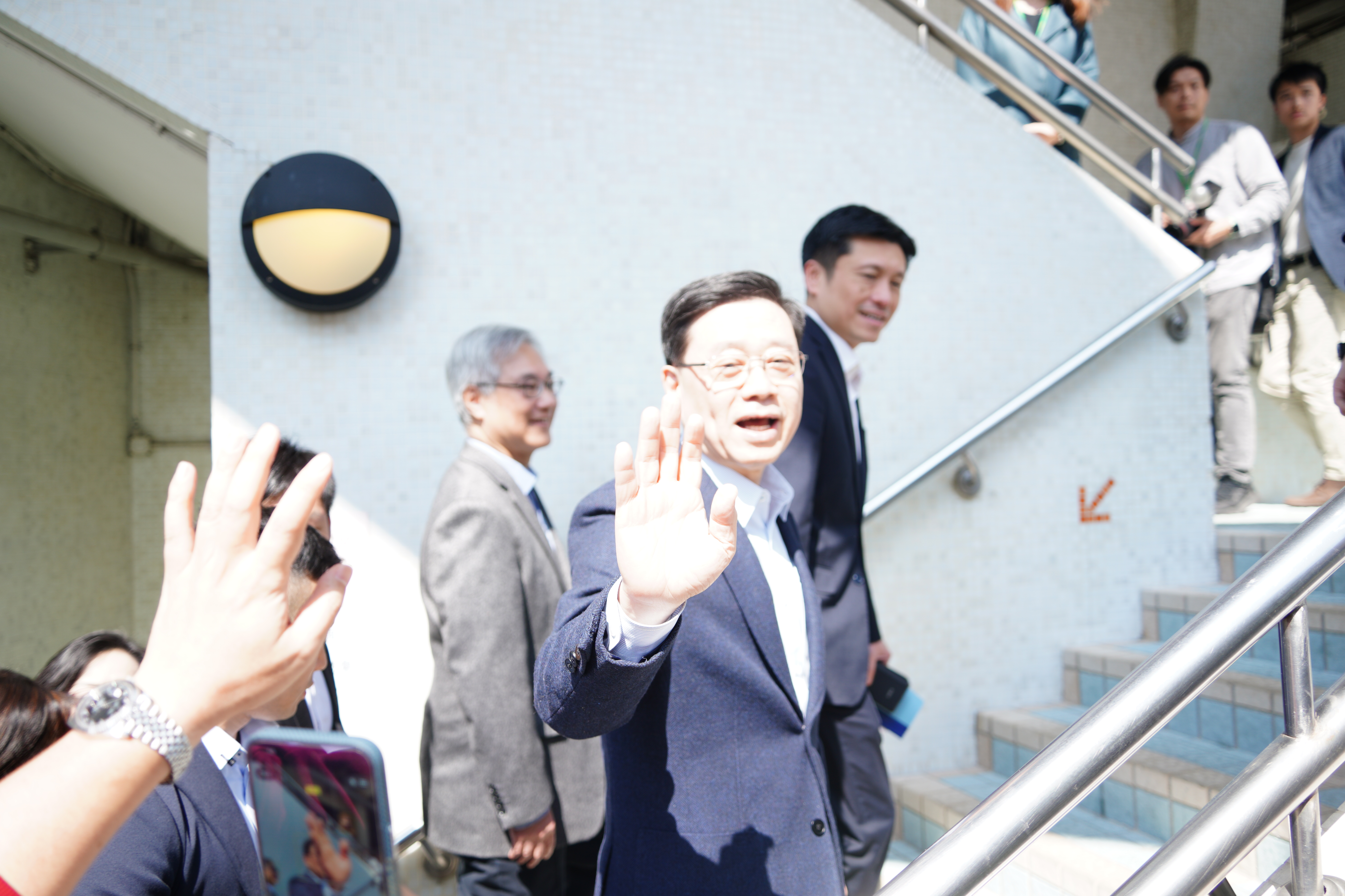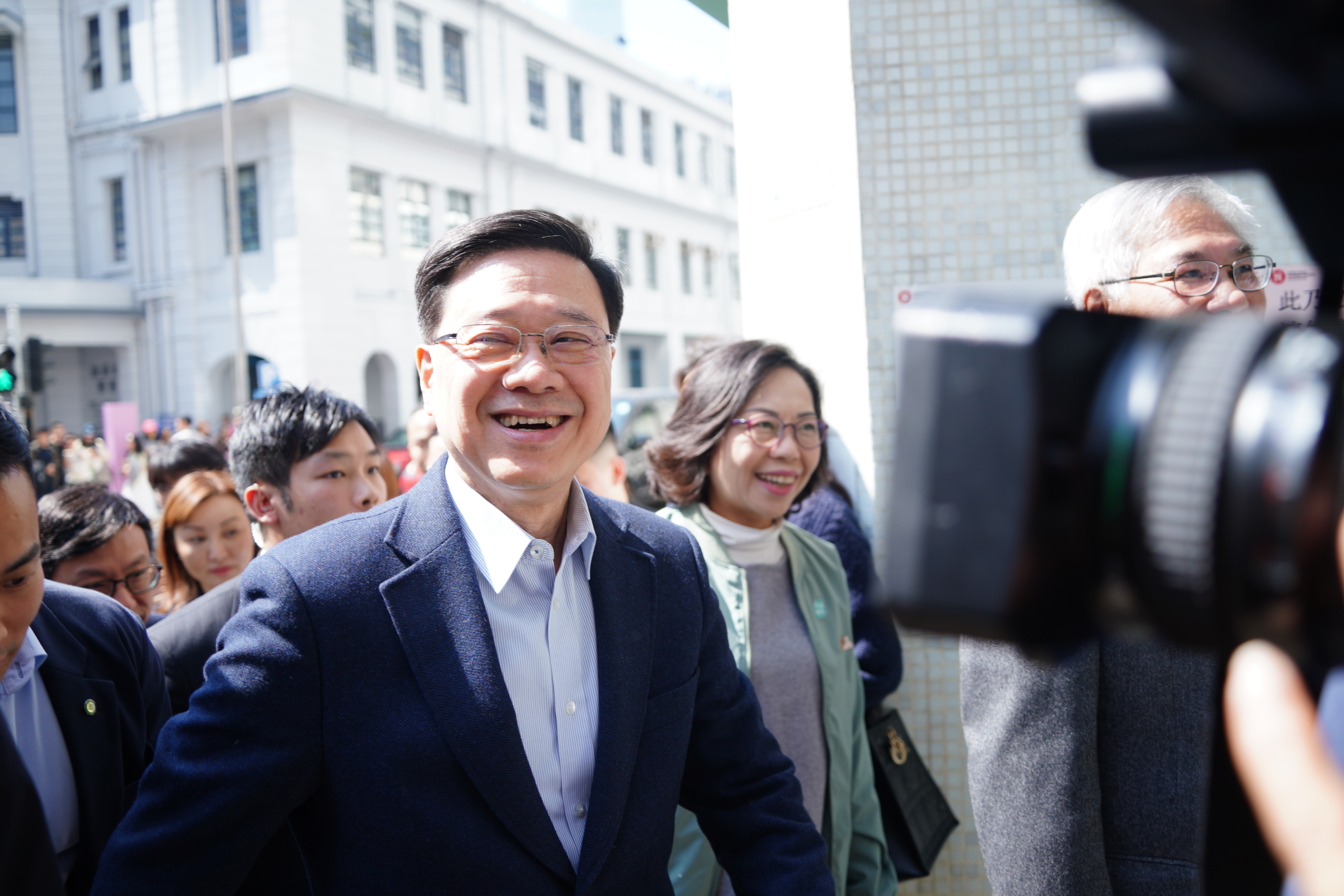 大公文匯全媒體報道,農曆新年將至,今日(13日)上午約11時半,李家超落區家訪,現身油麻地,親切跟沿途市民招手,道「新年好」。他祝市民「馬到功成」、「身體健康」。