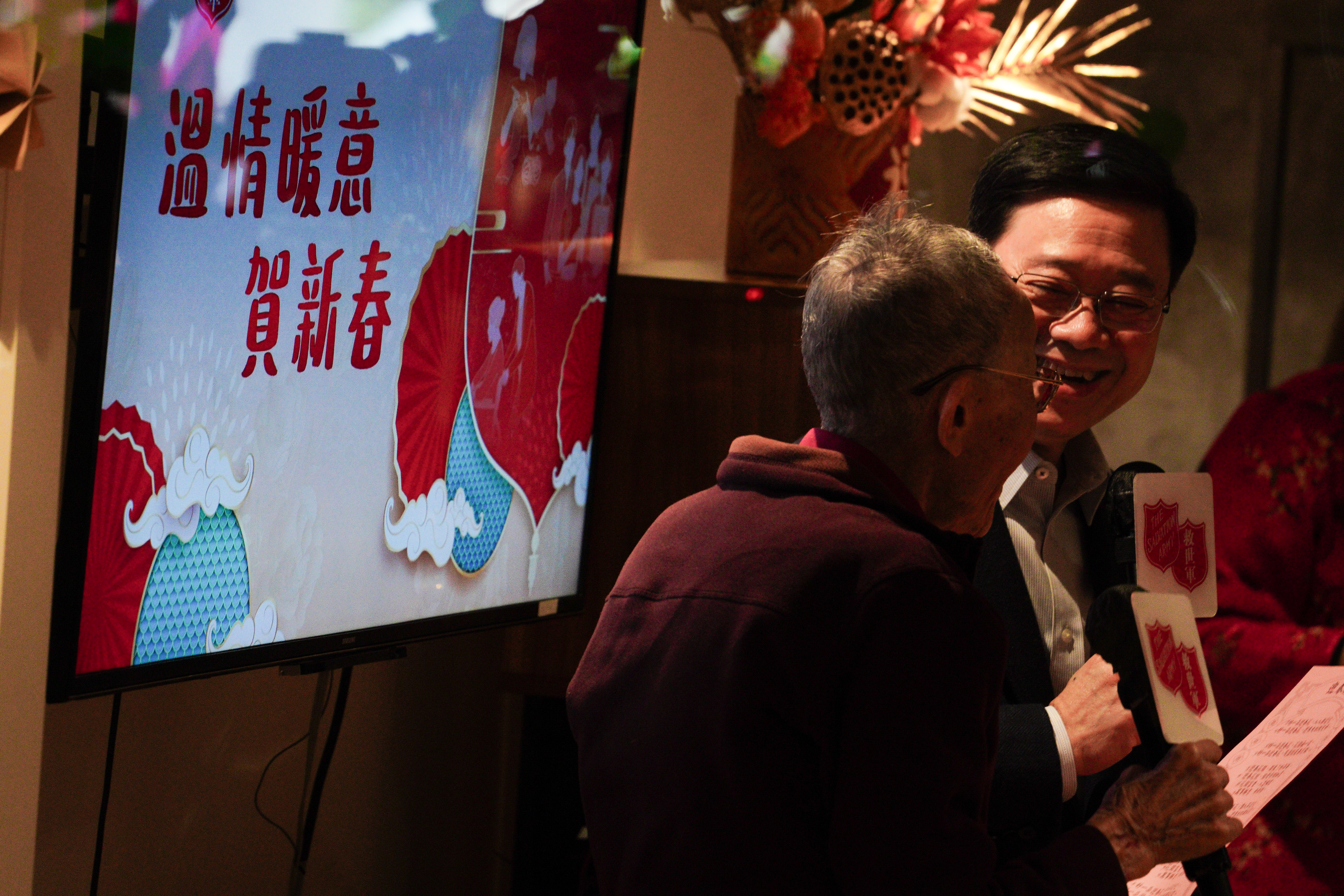 特首落區期間,到救世軍油麻地長者社區服務中心探訪長者。其中一名被稱為「坤叔」的長者與特首現場合唱《迎春花》,事後,坤叔指「十分榮幸」:「我跟特首說,希望他『乘風破浪』,他則祝我『身體健康』。」