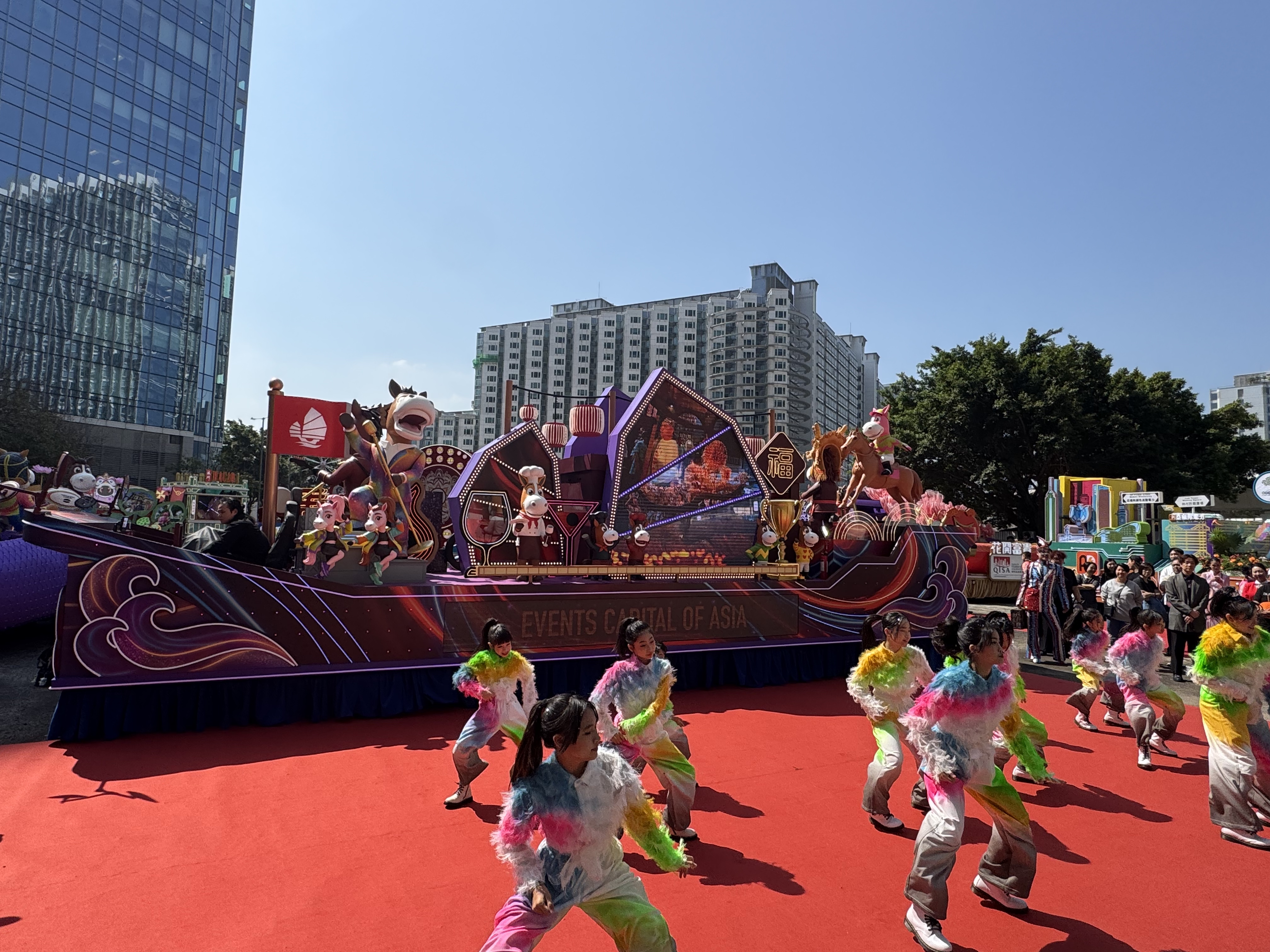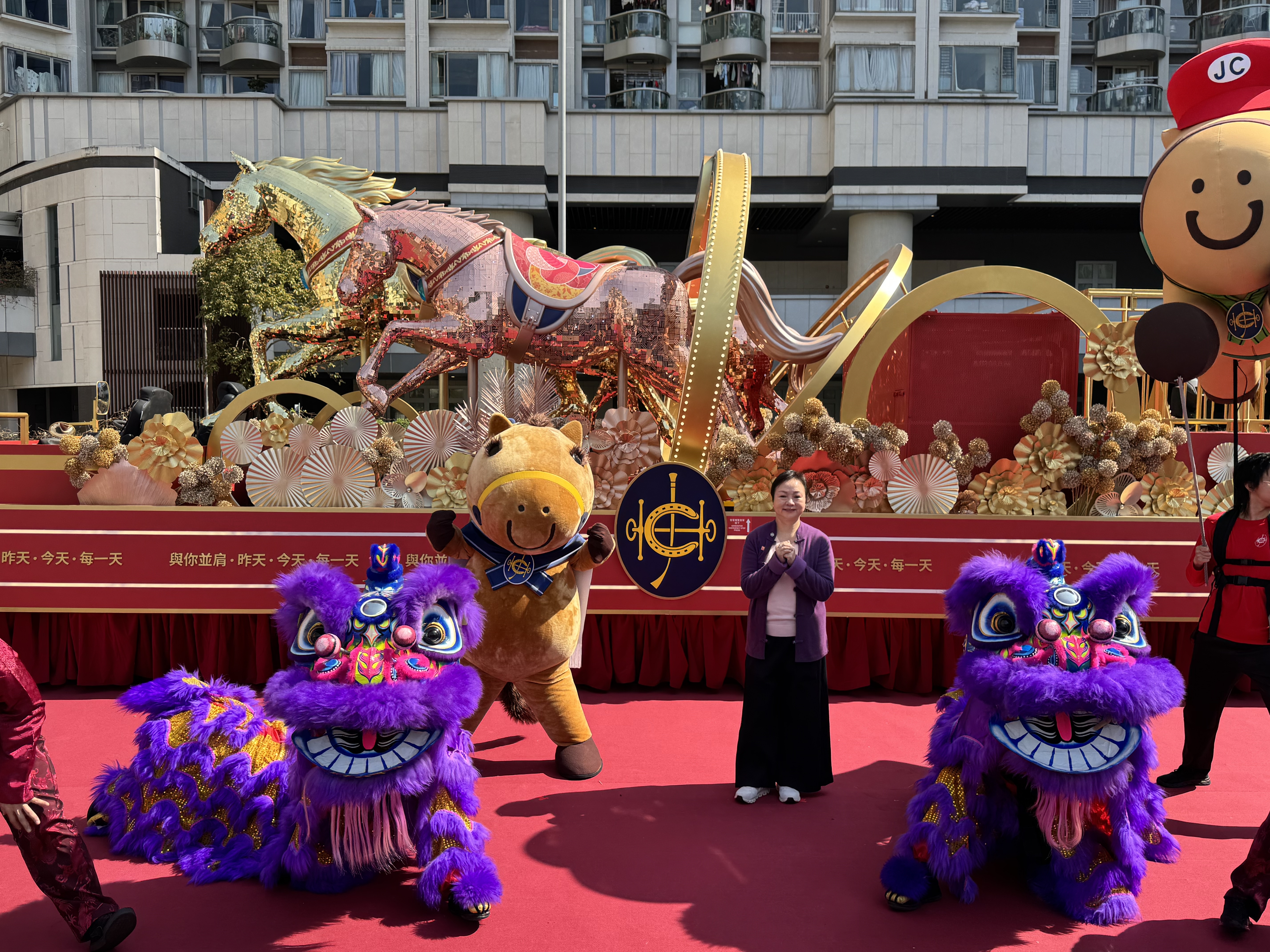 香港賽馬會與馬年更可謂是般配,其花車舞台中央設有3匹璀璨奪目的駿馬,象徵馬年朝氣蓬勃,巡遊當日,還將有馬會馬術隊騎手、亞洲錦標賽獎牌得主林立信及馬會見習騎師黃寶妮參與匯演。