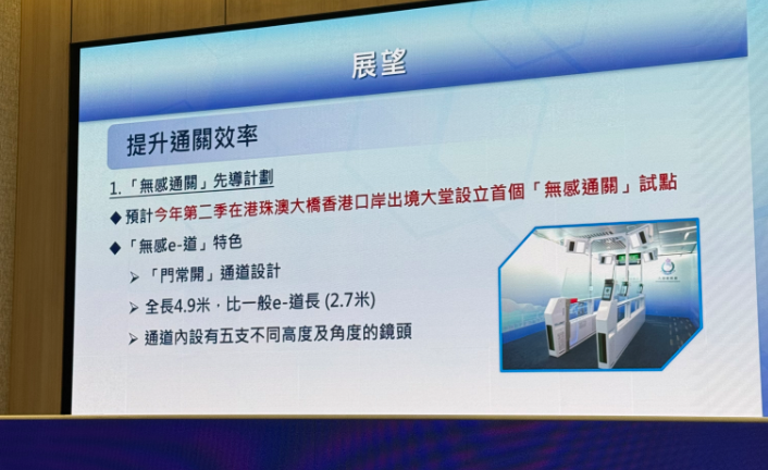 入境處介紹,「無感通關」先導計劃預計今年第二季推出,並將在今年第二季於港珠澳大橋香港口岸出境大堂設立首個「無感通關」試點。「無感e-道」將採用「門常開」通道設計,全長4.9米,比一般e-道(2.7米)長,通道內設有五支不同高度及角度的鏡頭,系統拍攝使用者容貌與入境處資料庫作即時比對,身份核實後便完成出境手續。
