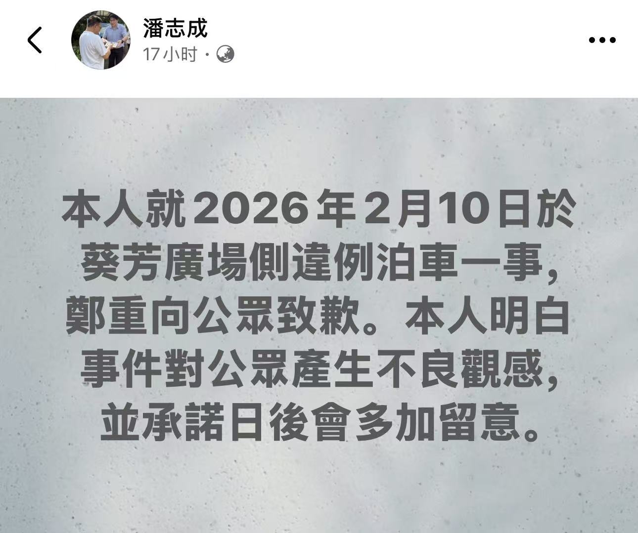 潘志成昨晚(12日)亦在社交平台發出帖文,就2月10日於葵芳廣場側違例泊車一事鄭重向公眾致歉,稱明白事件對公眾產生不良觀感,並承諾日後會多加留意。