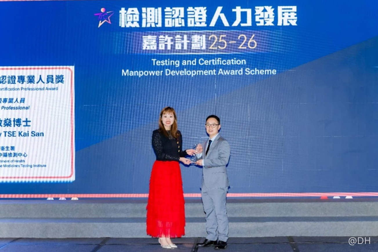 衞生署政府中藥檢測中心(檢測中心)連續兩屆榮獲由創新科技署全力支持、香港檢測和認證局主辦的「2025-26年度檢測認證人力發展嘉許計劃」中最高級別的「檢測認證人力發展機構獎(鉑金獎)」。此項嘉許再次肯定檢測中心在推動人才培訓及促進人力資源發展方面的持續努力與卓越成效。此外,檢測中心的化驗師謝啟燊博士亦獲頒「卓越檢測認證專業人員獎(高級專業人員)」,以表揚其專業成就與貢獻。
