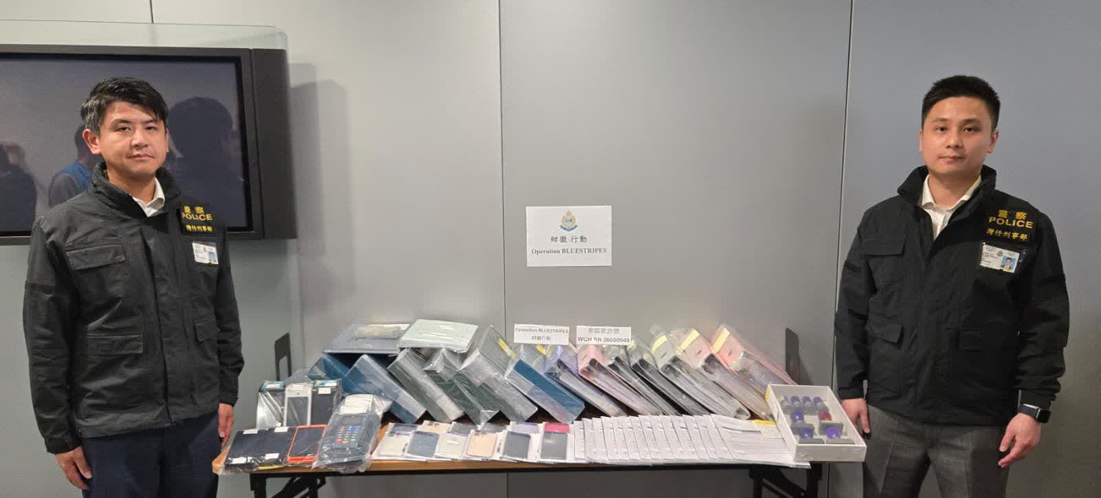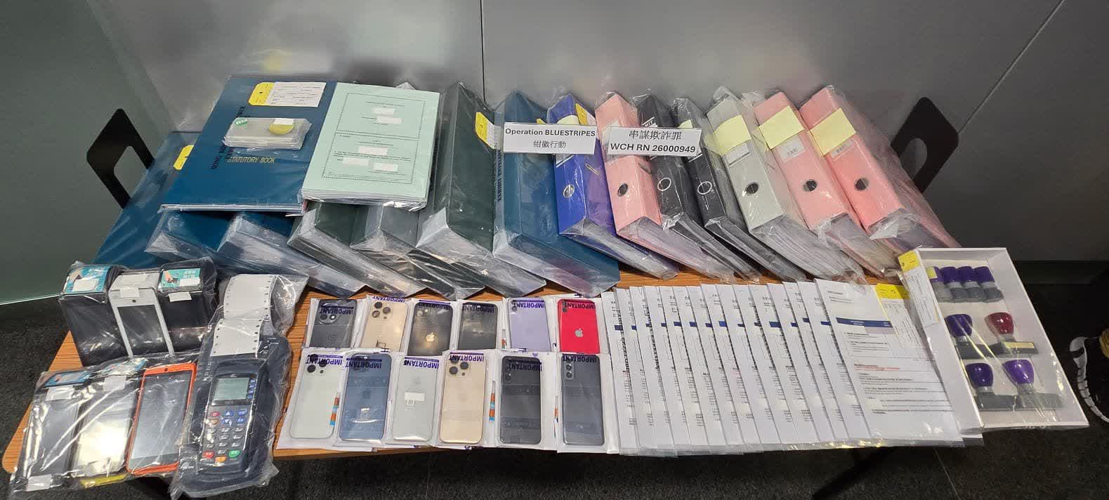 被捕21人(12男9女),年齡介乎25歲至59歲,包括7名骨幹成員、5名銷售員及9名傀儡戶口持有人,分別報稱文員、會計、公司董事及無業,涉嫌「串謀欺詐」罪名,通宵扣查。