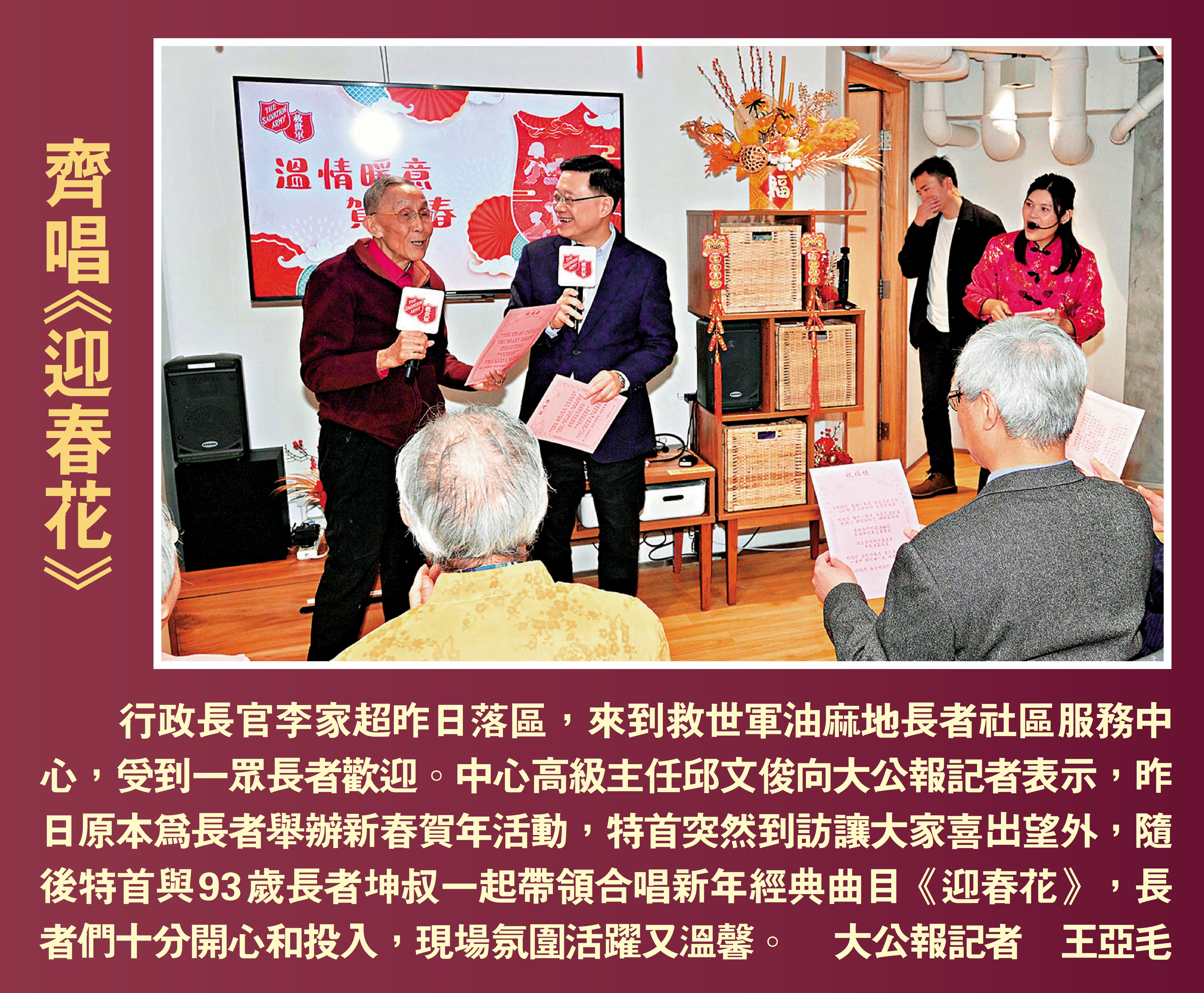 (大公報記者 沈安瑜)馬年即將來臨之際,行政長官李家超昨日率領特區政府主要官員落區進行歲晚家訪活動。李家超一早先到啟德青年驛站「啟航1331」,探訪在此暫住、受大埔宏福苑大火影響的居民,了解他們的生活環境。住戶表示滿意驛站的設施,希望政府能夠盡快處理好長遠住宿安排。李家超其後轉往油麻地駿發花園探訪長者,了解街坊的生活,並送上新春祝福。