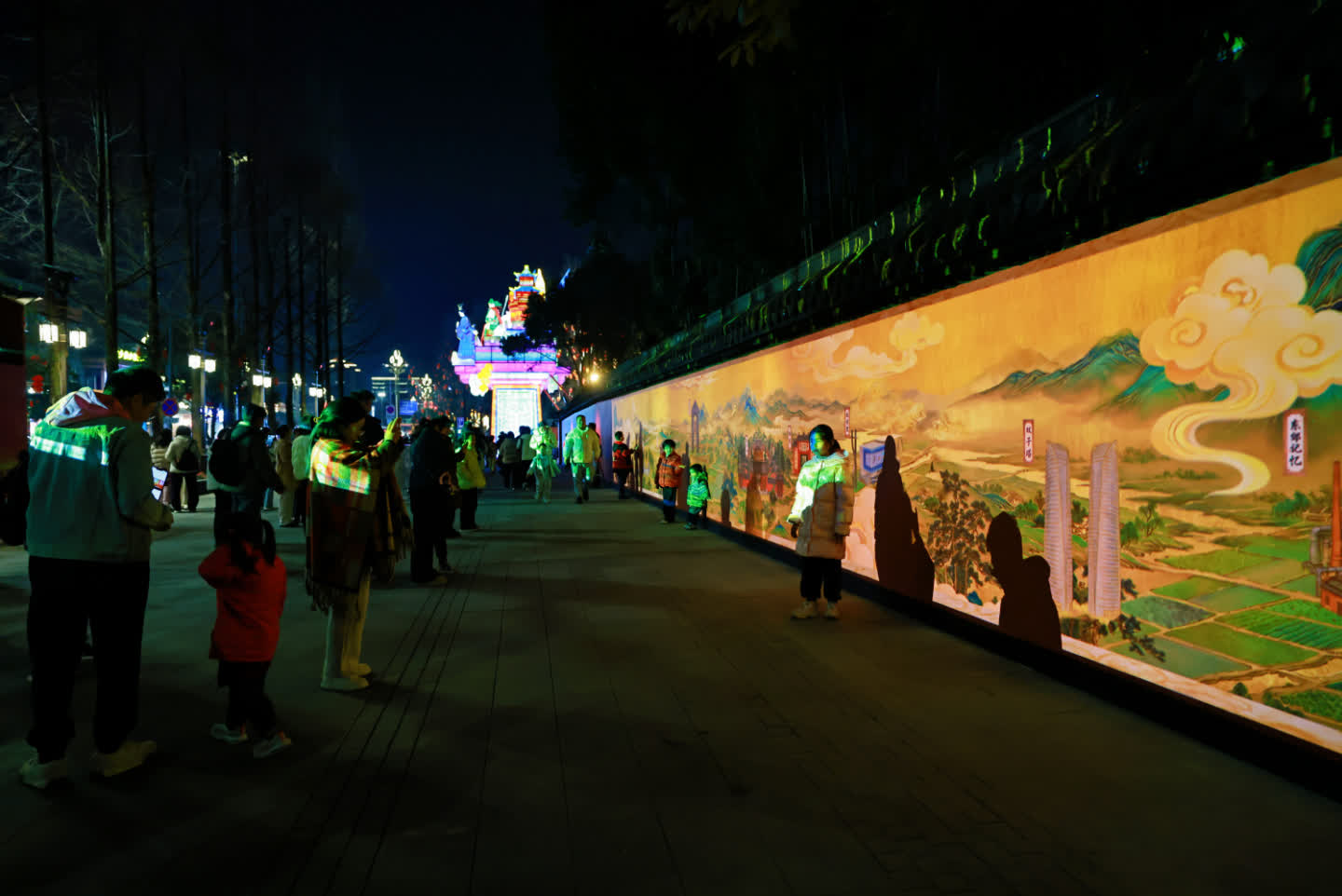 現場可以看到,規格創下歷年之最的「君臣之交·漢室長明」湖面主燈組,無疑是廟會核心視覺地標。這一燈組45米長、45米寬、22米高,以武侯祠「君臣合祀」格局為靈感,串聯「隆中對」「出師表」「北伐」等關鍵節點,將劉備與諸葛亮「魚水相得」的情誼具象化,成為遊客們打卡的熱門點位。