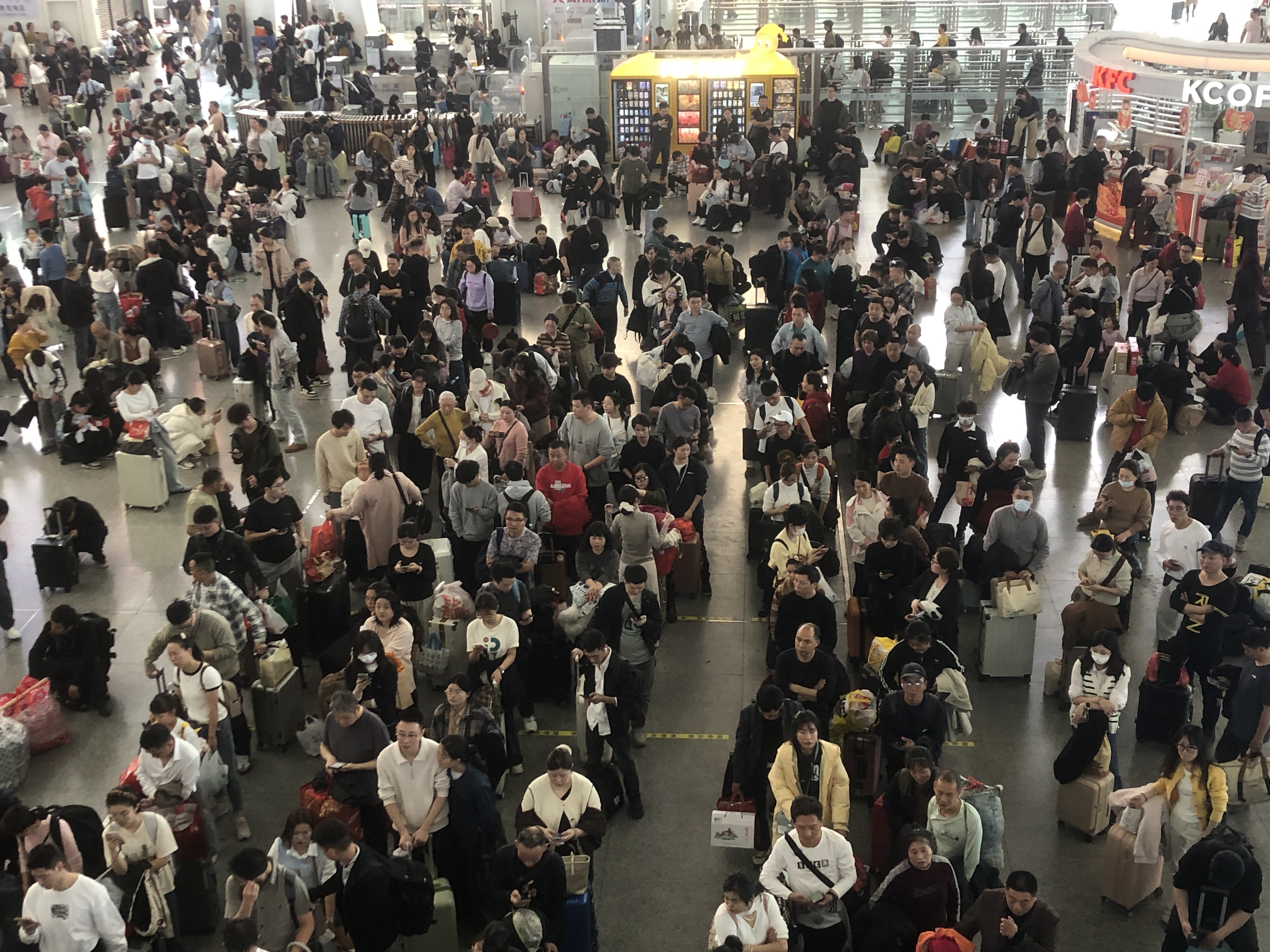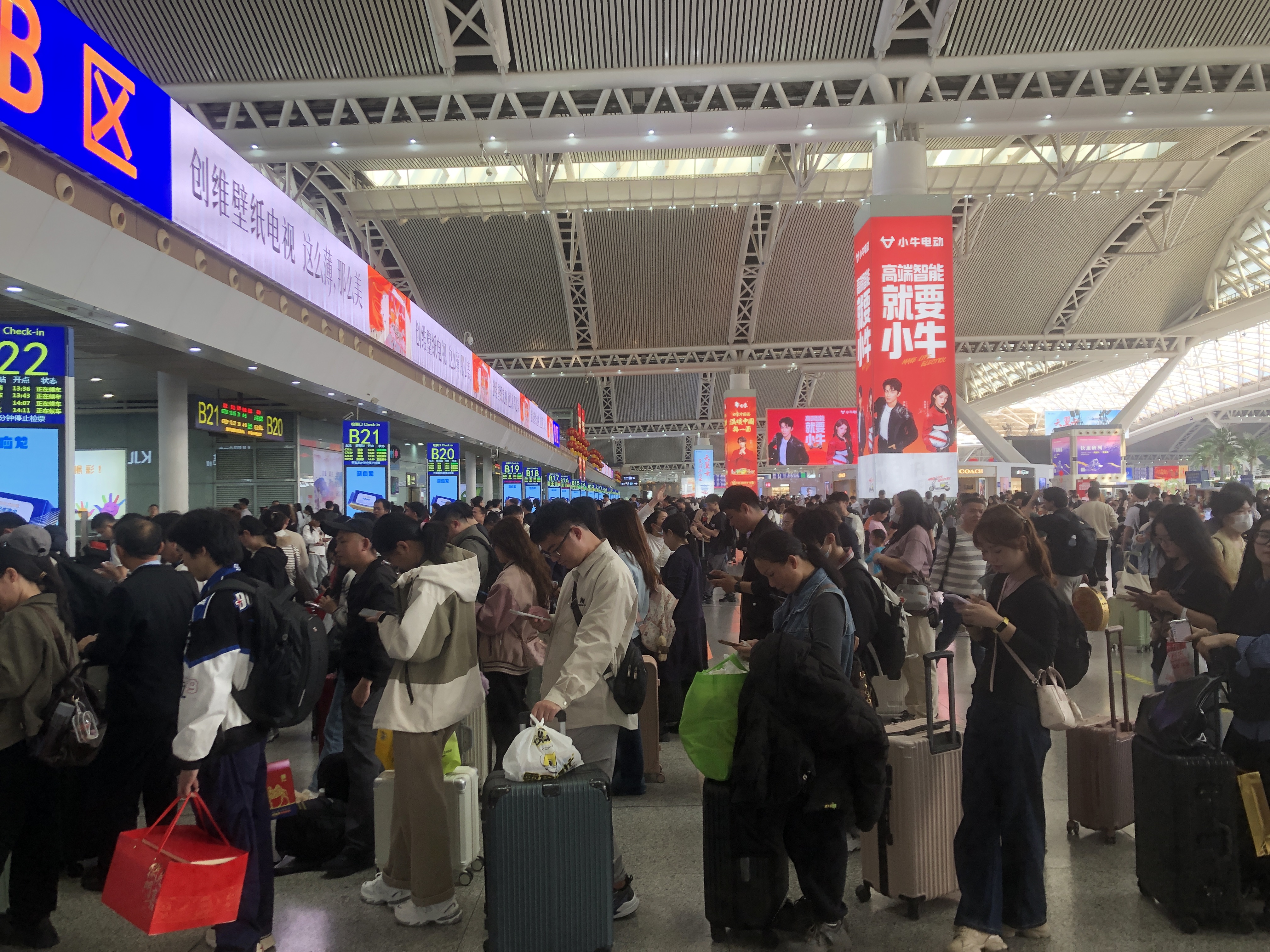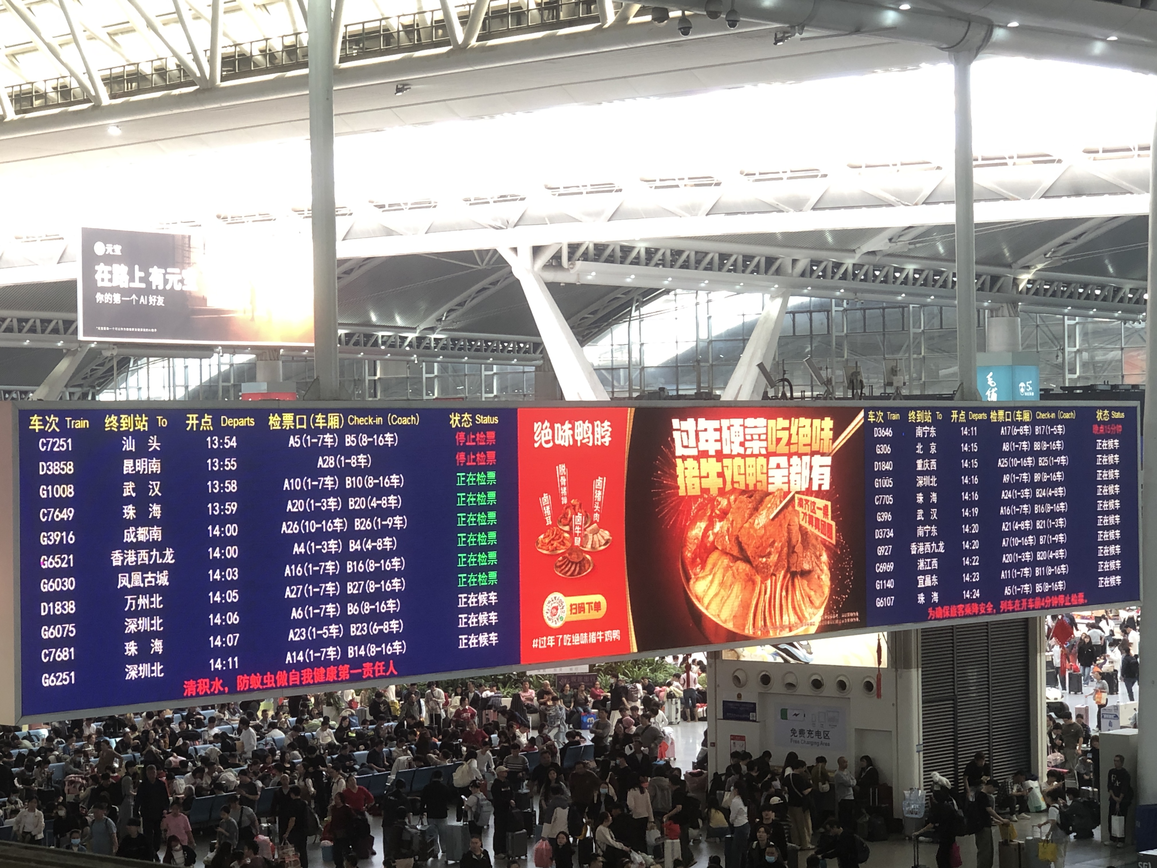 記者14日在廣州南站看到,候車大廳內人山人海,座椅座無虛席,不少旅客甚至在樓梯角落或席地而坐等待列車。站內的電子信息屏上車次密集排列,幾乎「一分鐘一班」,「正在檢票」「正在候車」的提示輪番跳動,站台口人流如織。