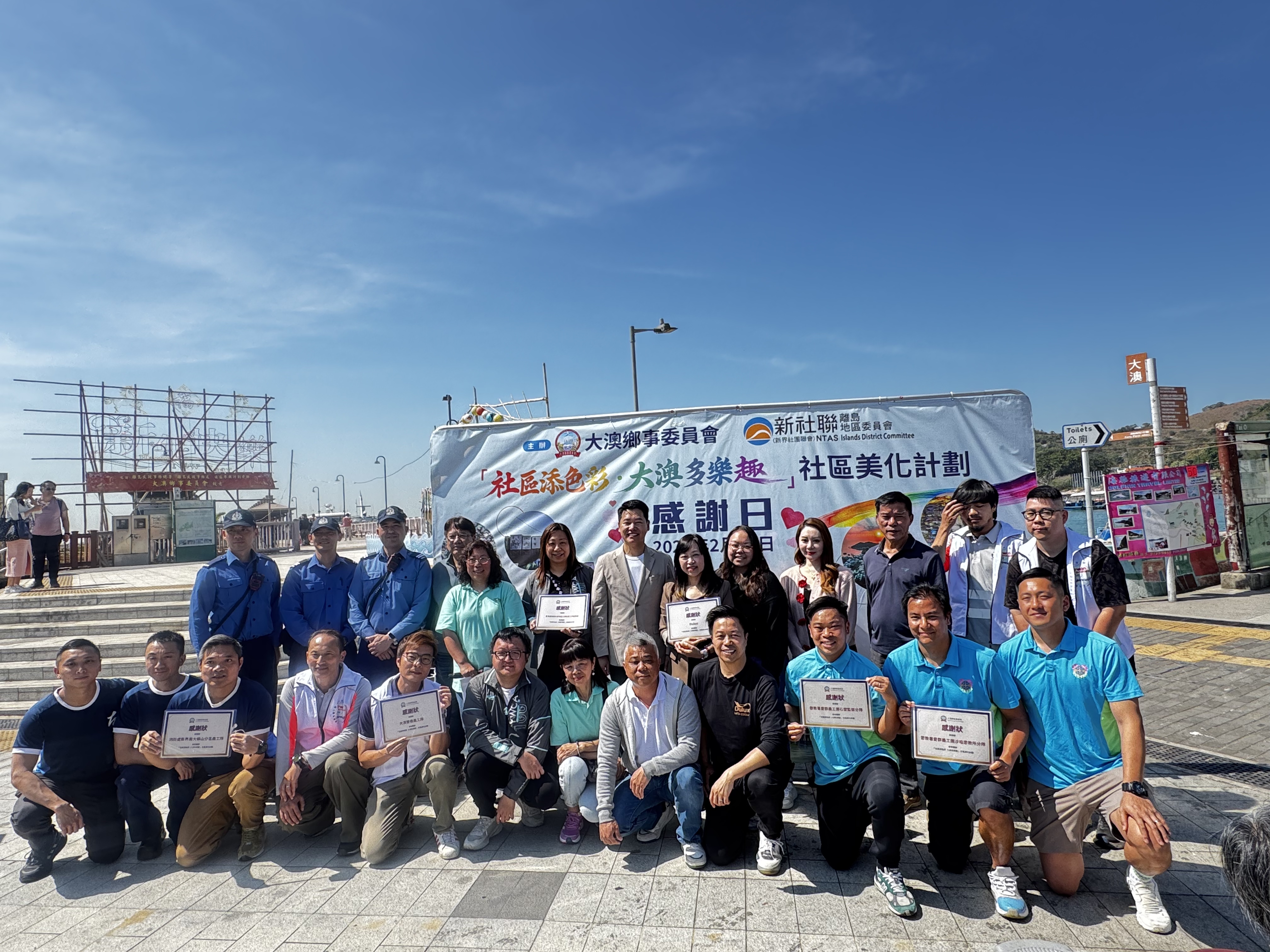 (大公文匯全媒體 記者 周傾芫)一排五彩繽紛的水上棚屋倒映在水道之中,為素有「東方威尼斯」之稱的大澳漁村,添上一抹活力色彩。首階段的美化計劃,共為五間鐵皮棚屋換上藍、紫、黃、綠等新裝。有別於一般油漆,這次採用的具備防水與隔熱功能,既美觀又實用。今日(14日)的感謝儀式上,一眾參與機構包括贊助商Dulux、香港紅十字會、消防處、懲教署、大澳義工隊等的義工聚首一堂,接受由大澳鄉事委員會主席何紹基、新社聯離島地區委員會主席祝慶台頒發的感謝狀。