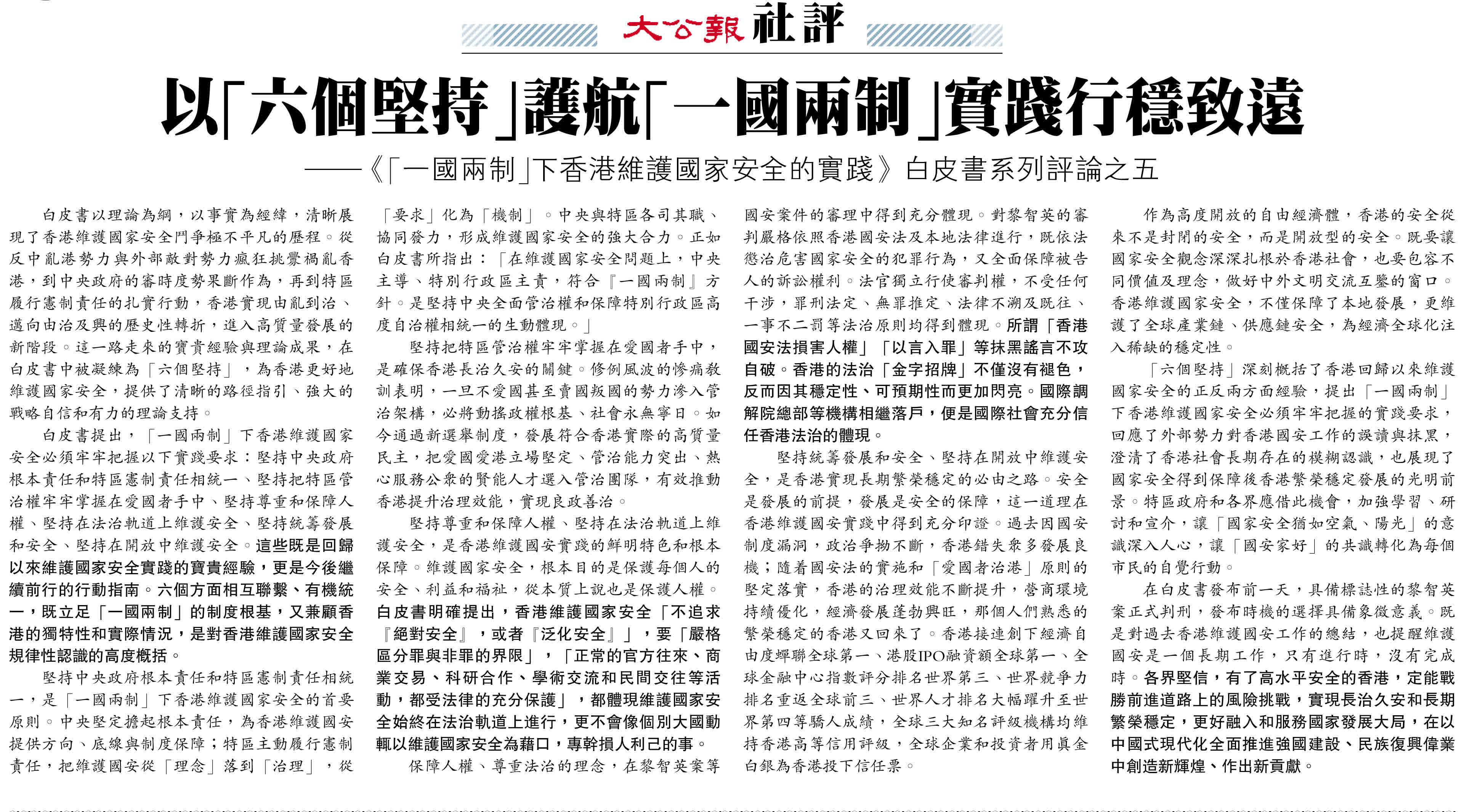 「六個堅持」深刻概括了香港回歸以來維護國家安全的正反兩方面經驗,提出「一國兩制」下香港維護國家安全必須牢牢把握的實踐要求,回應了外部勢力對香港國安工作的誤讀與抹黑,澄清了香港社會長期存在的模糊認識,也展現了國家安全得到保障後香港繁榮穩定發展的光明前景。特區政府和各界應借此機會,加強學習、研討和宣介,讓「國家安全猶如空氣、陽光」的意識深入人心,讓「國安家好」的共識轉化為每個市民的自覺行動。