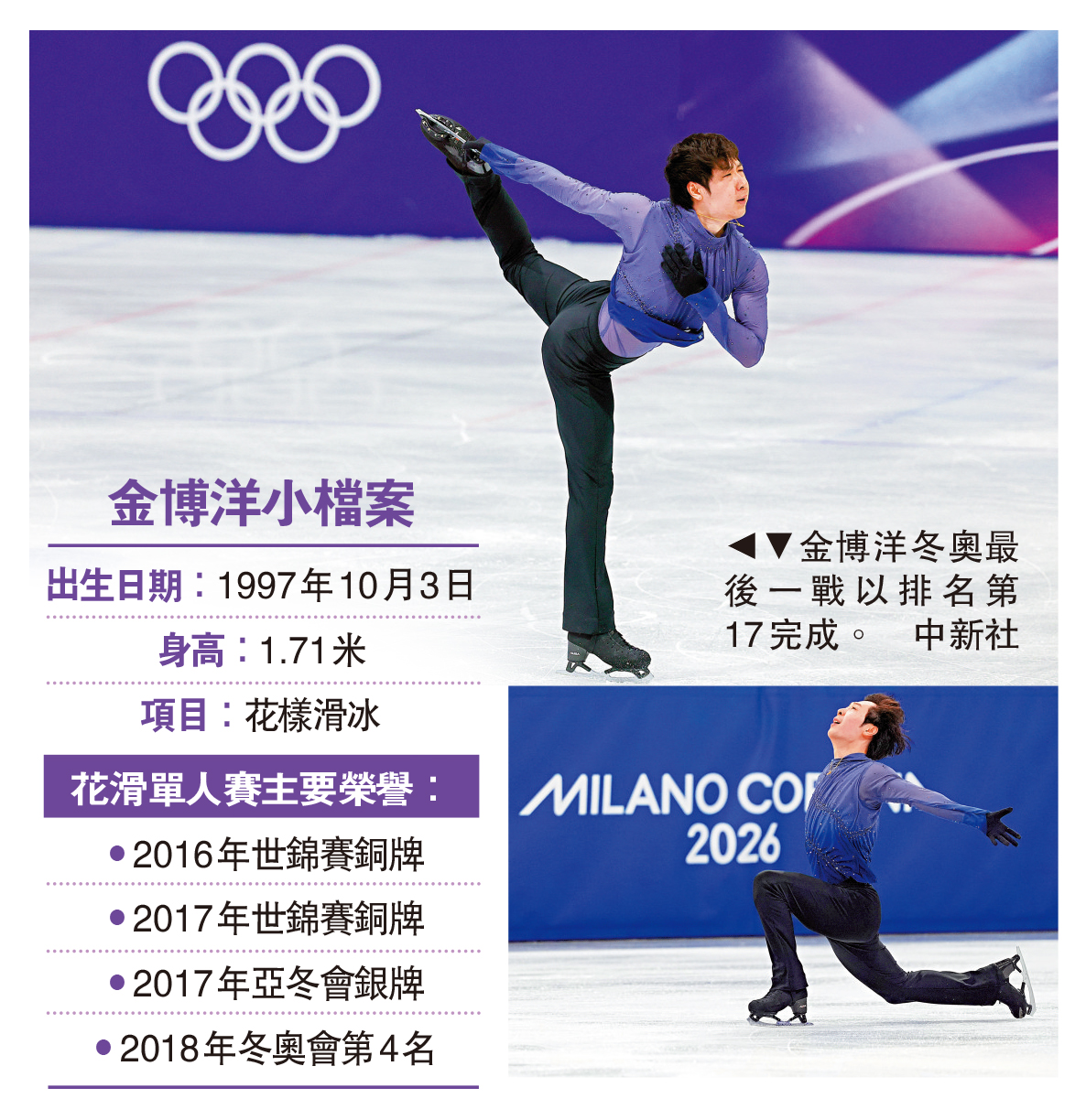大公報綜合新華網報道,13日的米蘭冬奧會上,花滑老將金博洋則迎來冬奧謝幕演出。