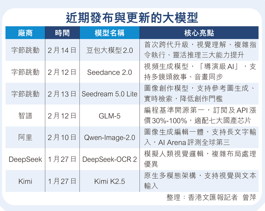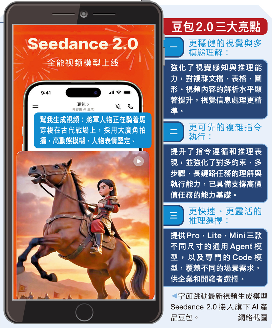 (香港文匯報 記者 曾萍)臨近春節,中國AI產業迎來「集體爆發」。從點上看,Seedance 2.0火爆全球,Vidu Q3登頂全球權威榜單,豆包大模型2.0推理能力躍升成行業焦點;從線上看,阿里、DeepSeek、Kimi等在通用對話、編程、多模態、視頻生成各賽道密集「亮劍」;從面上看,這些現象級產品意味着在視頻生成領域,中國AI已穩穩站上全球第一梯隊。短短數年,從ChatGPT、Sora時代的技術旁觀者,到DeepSeek突圍的自主引領,這場由「點」及「線」再成「面」的躍遷,讓中國AI完成了從追趕到並跑的跨越。
