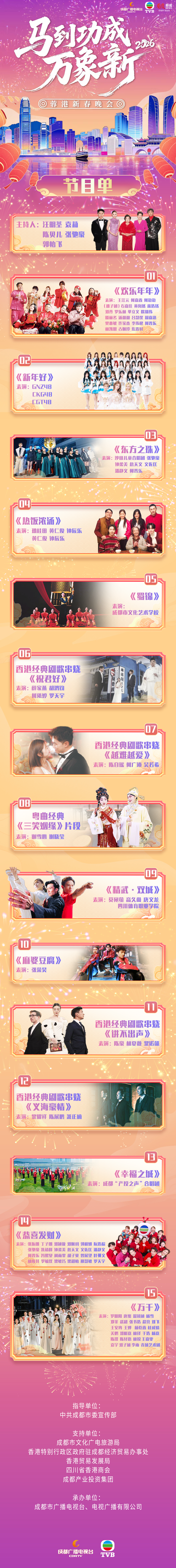 晚會尾聲,成都廣播電視台全體主持人獻唱《萬千》,奏響「龍馬精神、萬象更新」的昂揚祝願,為這場蓉港文化盛宴畫上圓滿句號。15 個精心打磨的節目串聯起雙城情誼,完美詮釋「同心同行,共赴新程」的新春深意。