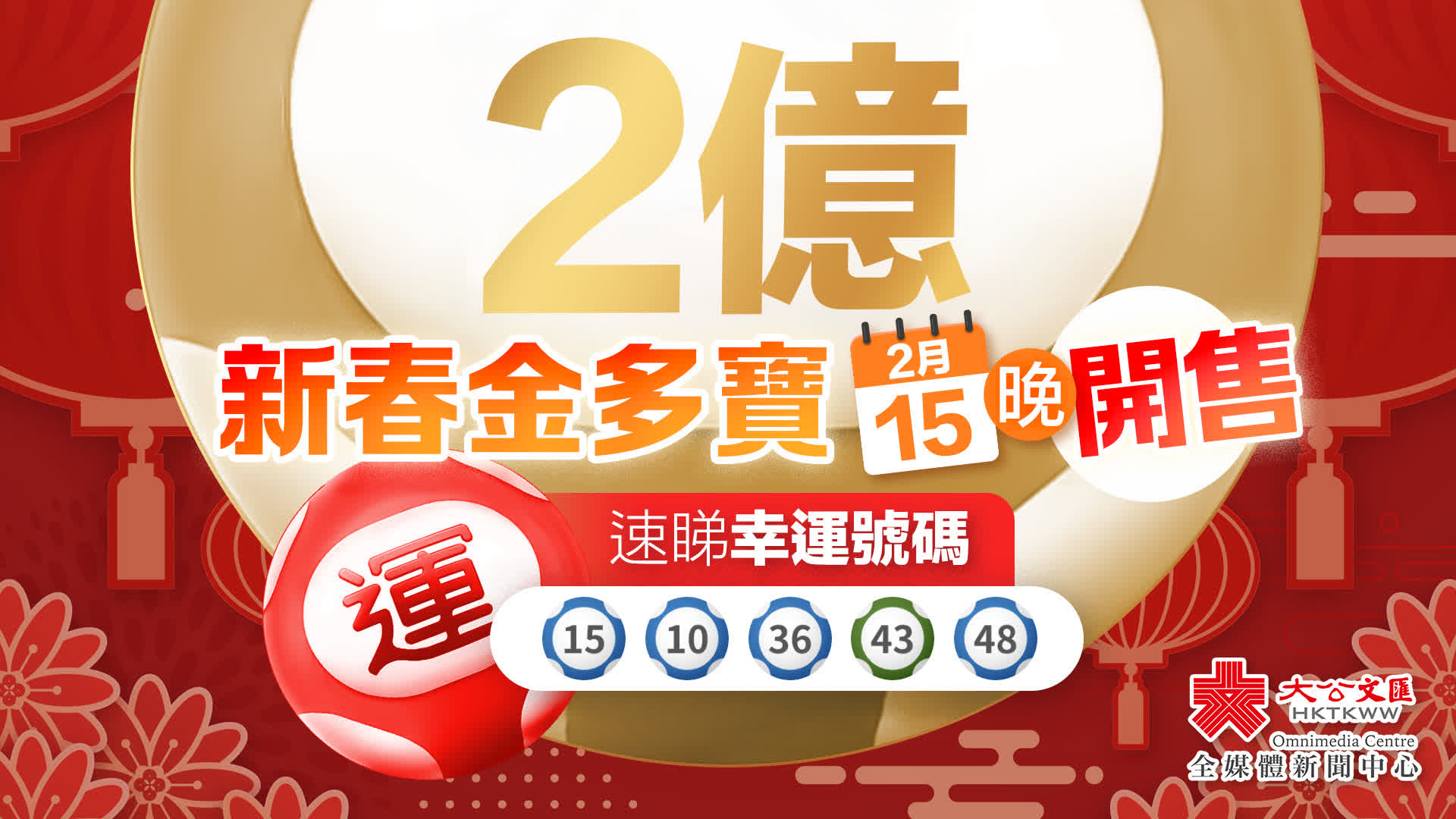 今次新春金多寶是六合彩推出50年以來最高的頭獎彩金,亦是最大規模的新春金多寶。市民可通過各場外投注處、電話投注(包括1886電話投注自動服務系統)及數碼平台進行投注,售票截止時間為年初五2月21日(星期六)晚上9時15分,攪珠時間為當晚9時30分。