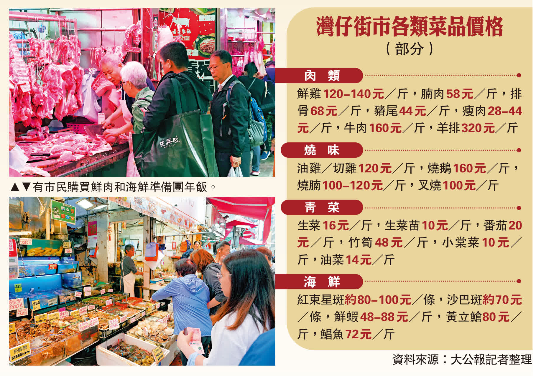 年廿八的灣仔及鵝頸街市,不少市民開始備貨做節,購買鮮肉、燒臘、蔬果等預備團年飯。港人「做節」食飯必不可少的雞,售價為120至140元一斤,腩肉58元一斤、排骨68元一斤,生菜等時蔬為10至16元一斤。多位檔主均表示,今年除夕沒有加價。有菜檔檔主笑言「不加價啦,讓大家買得順心,開心過大年」。有燒臘檔則預計除夕油雞、切雞每隻漲價10元至130元。