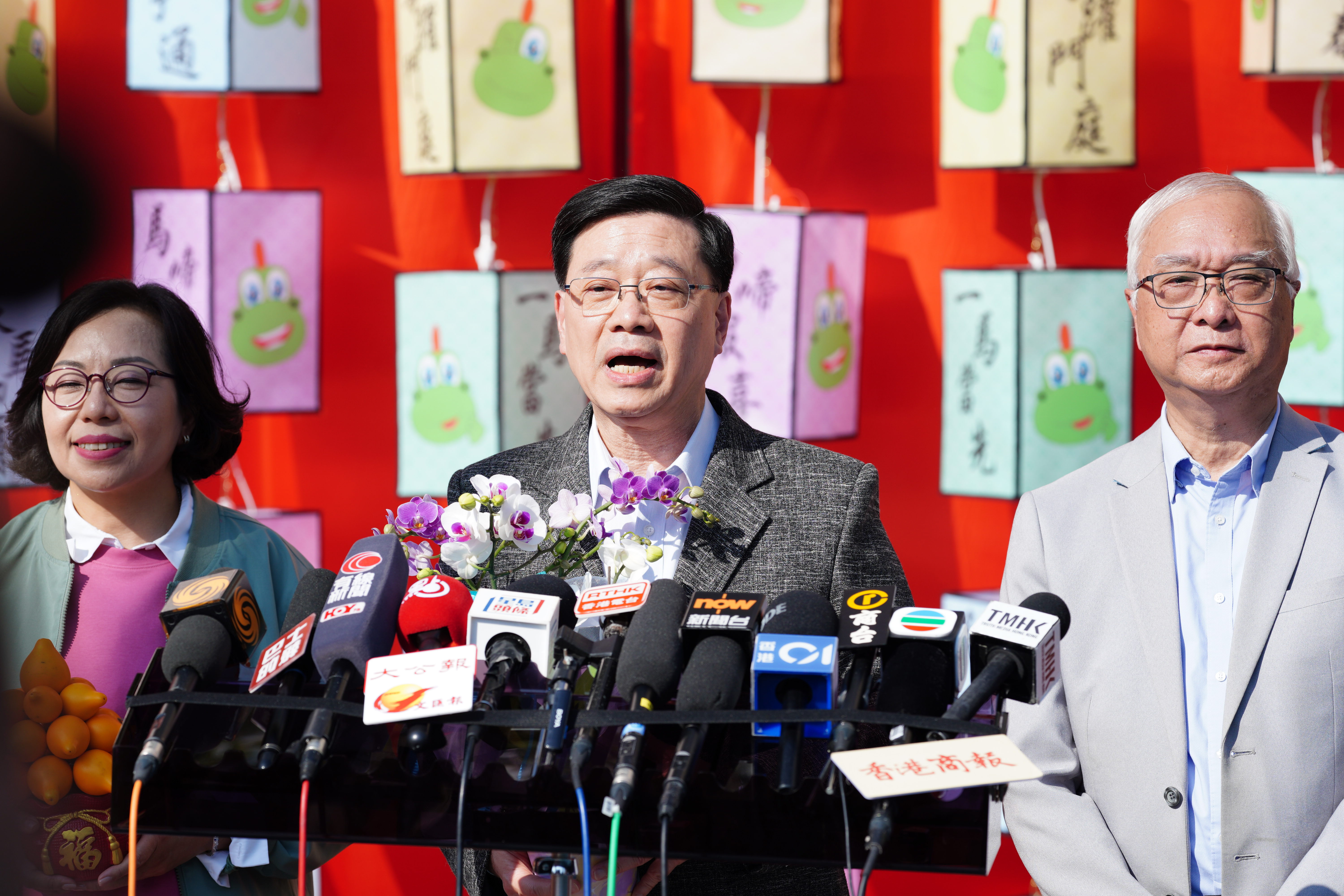 李家超表示,來到觀塘花市感受新春氣氛,見到人頭湧湧,令他回想起以前與家人行花市的特別回憶。他分享自己今日購買了三種年花:一是銀柳,象徵活力生機,能夠一直開花至春天;其次是「五代同堂」,寓意合家歡樂、平安;三是蘭花,代表高雅,寓意好事連連。