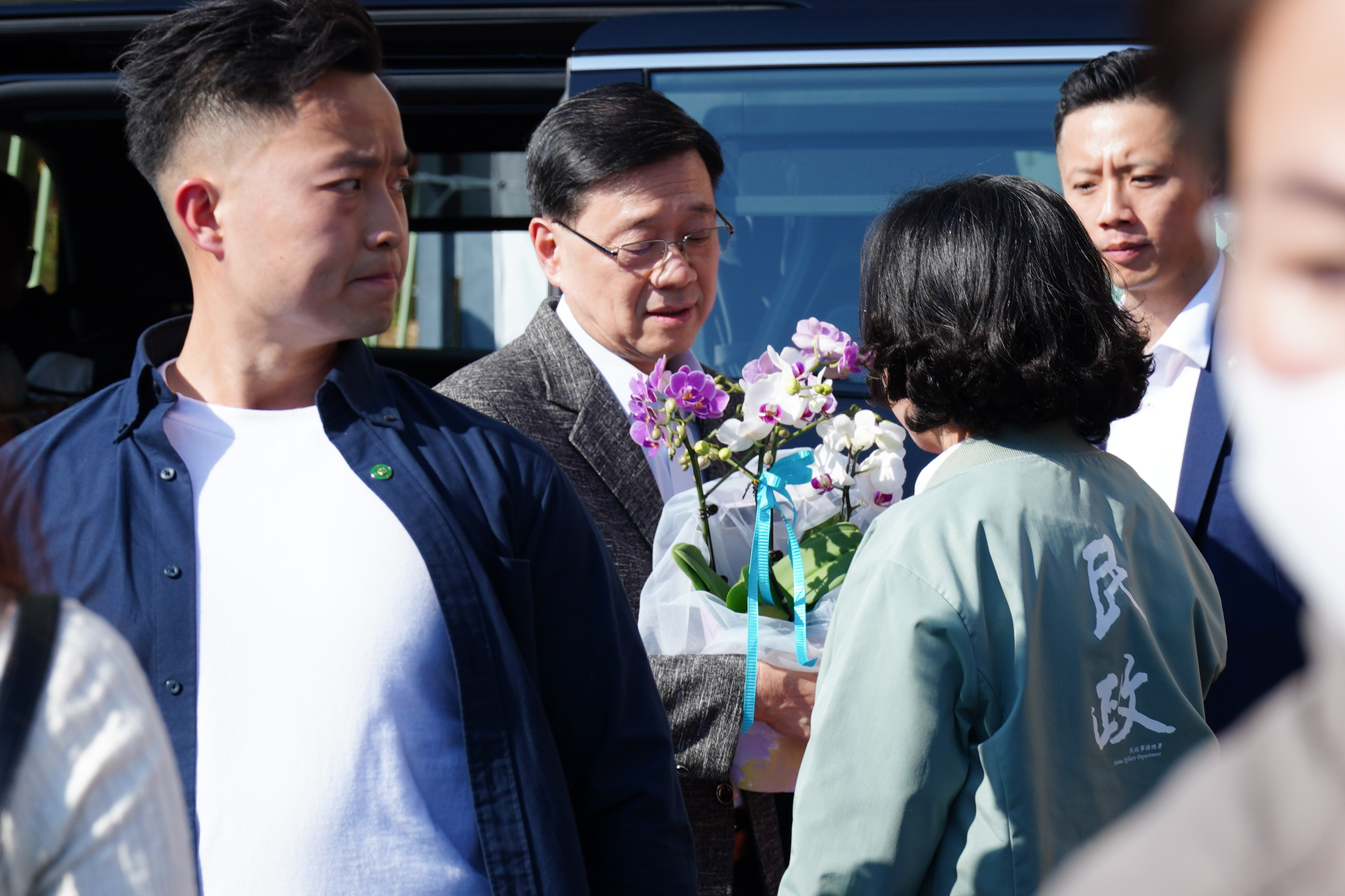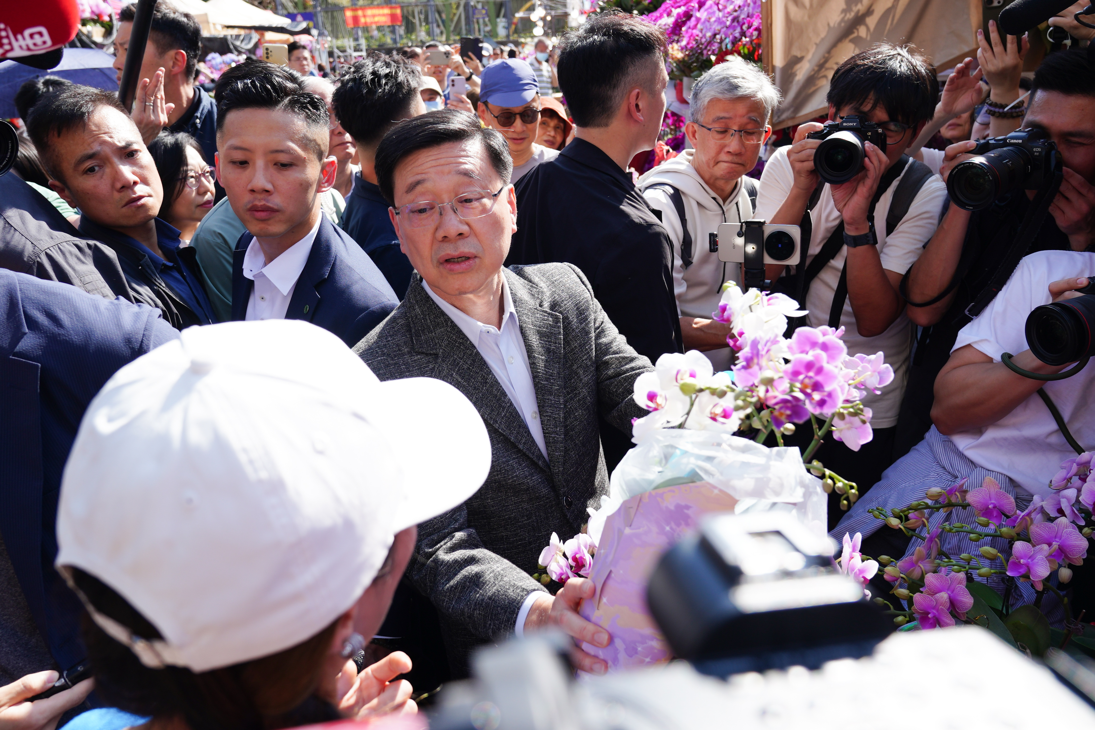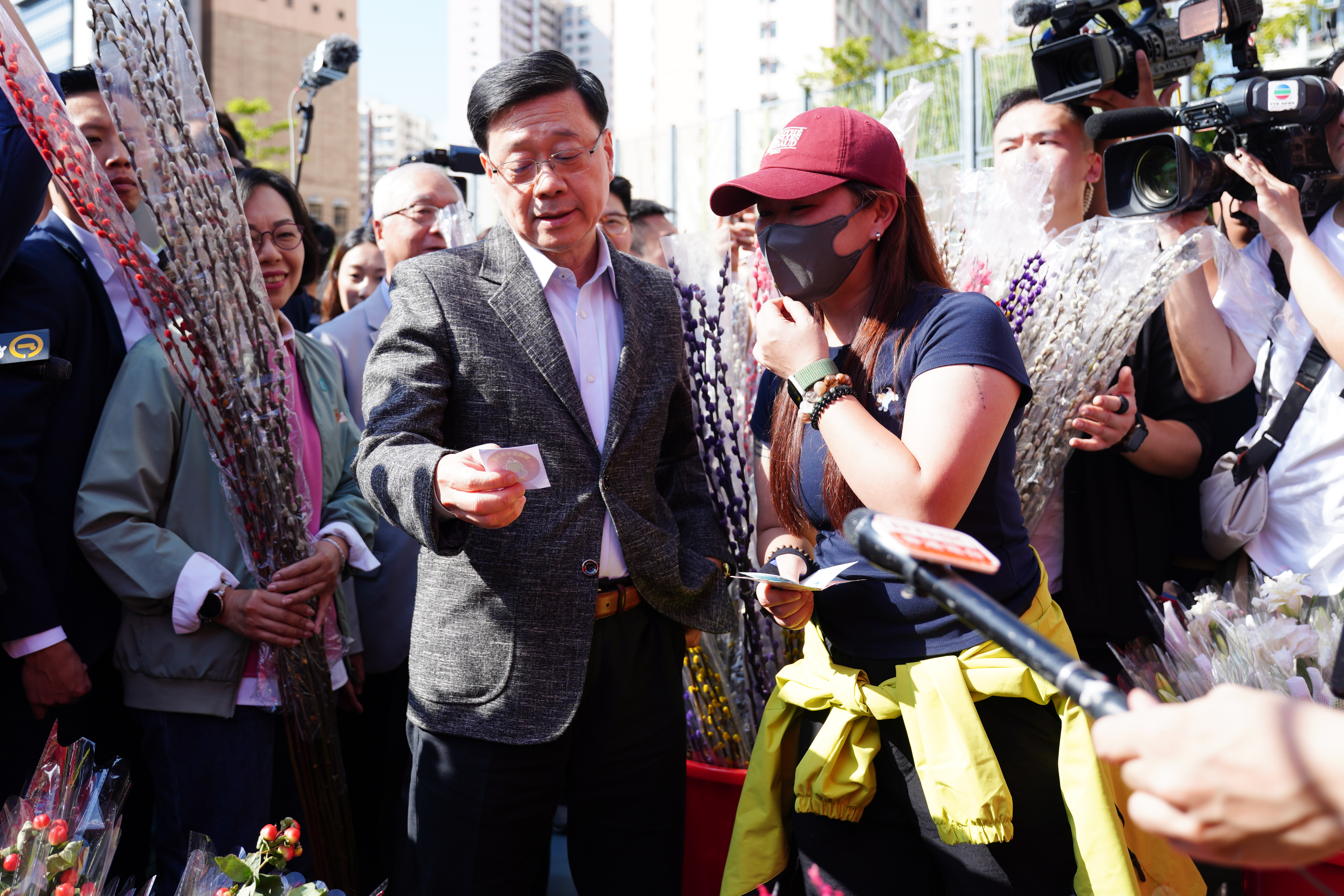 (大公文匯全媒體 記者 王俊傑)今日(16日)年廿九,是團年喜慶的日子。行政長官李家超繼上周歲晚家訪後,今日下午聯同民政及青年事務局局長麥美娟、環境及生態局局長謝展寰等官員,到訪觀塘遊樂場年宵市場,同市民共賀馬年。李家超先花費120元購買銀柳,寓意財富滾滾,後購買價值80元的「五代同堂」,然後掏出100元付款,向商戶說「十全十美唔使找」;再以800元分別購買一束199元和一盆598元的蘭花,祝商戶「大家都發、馬年一路發」。