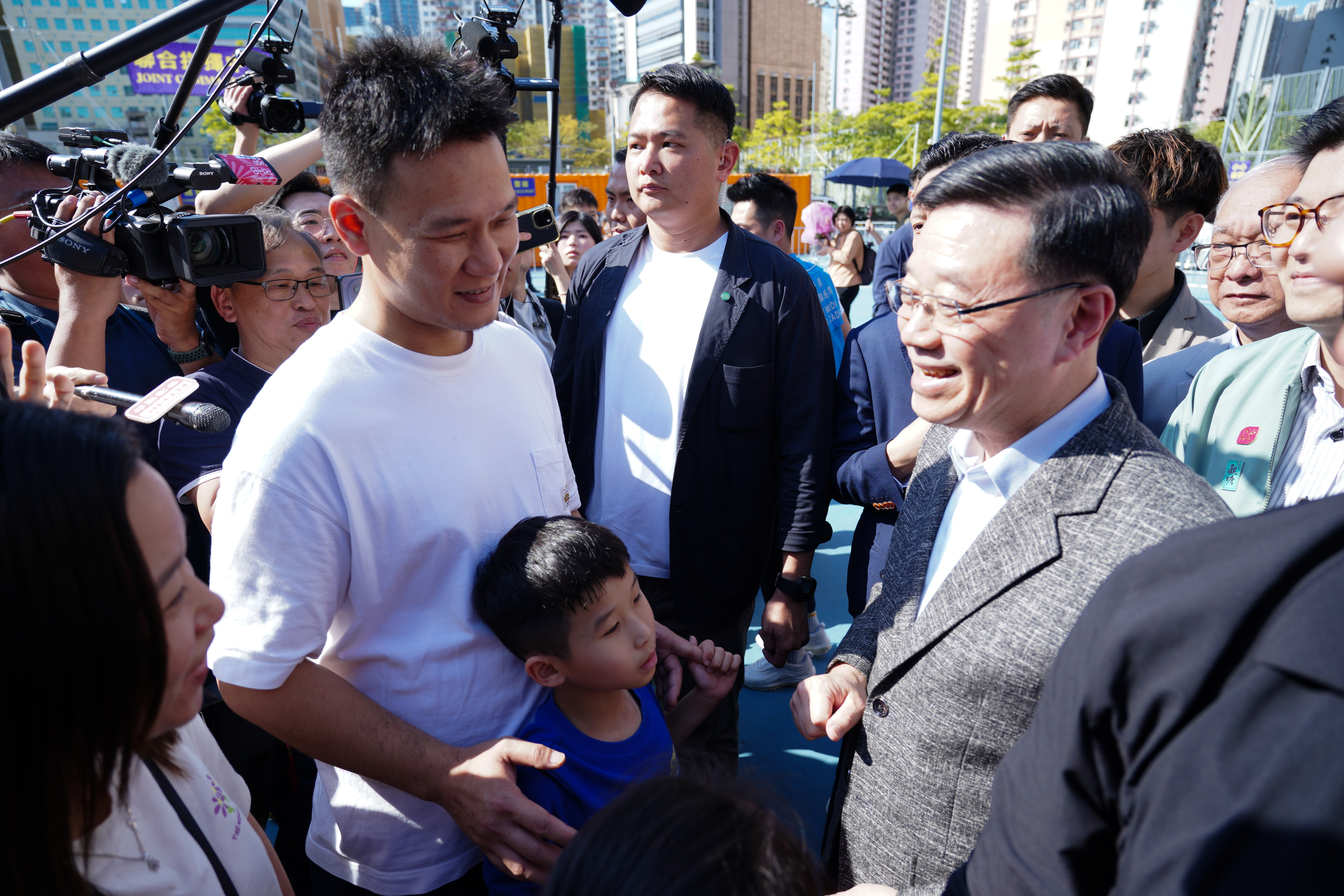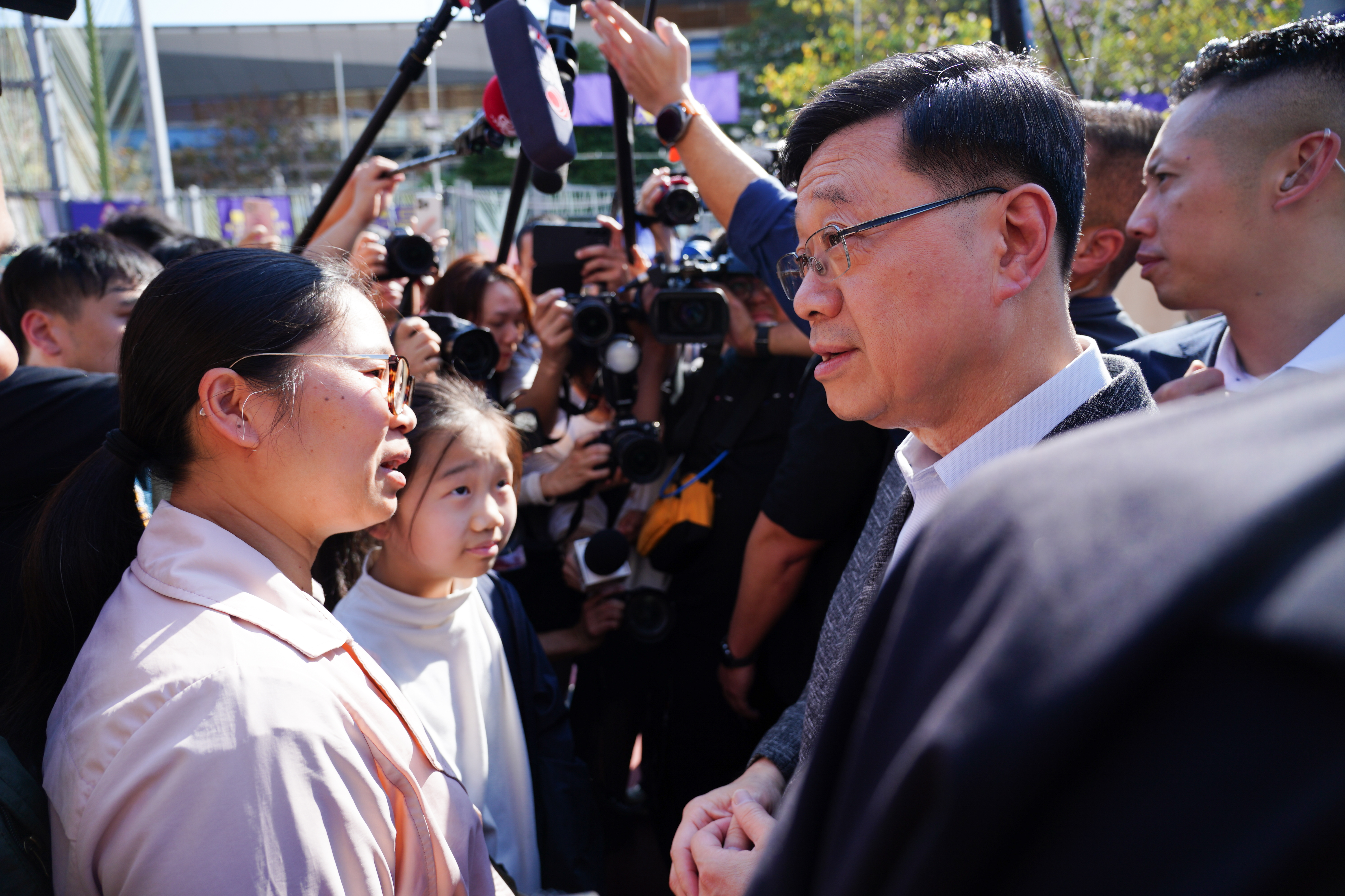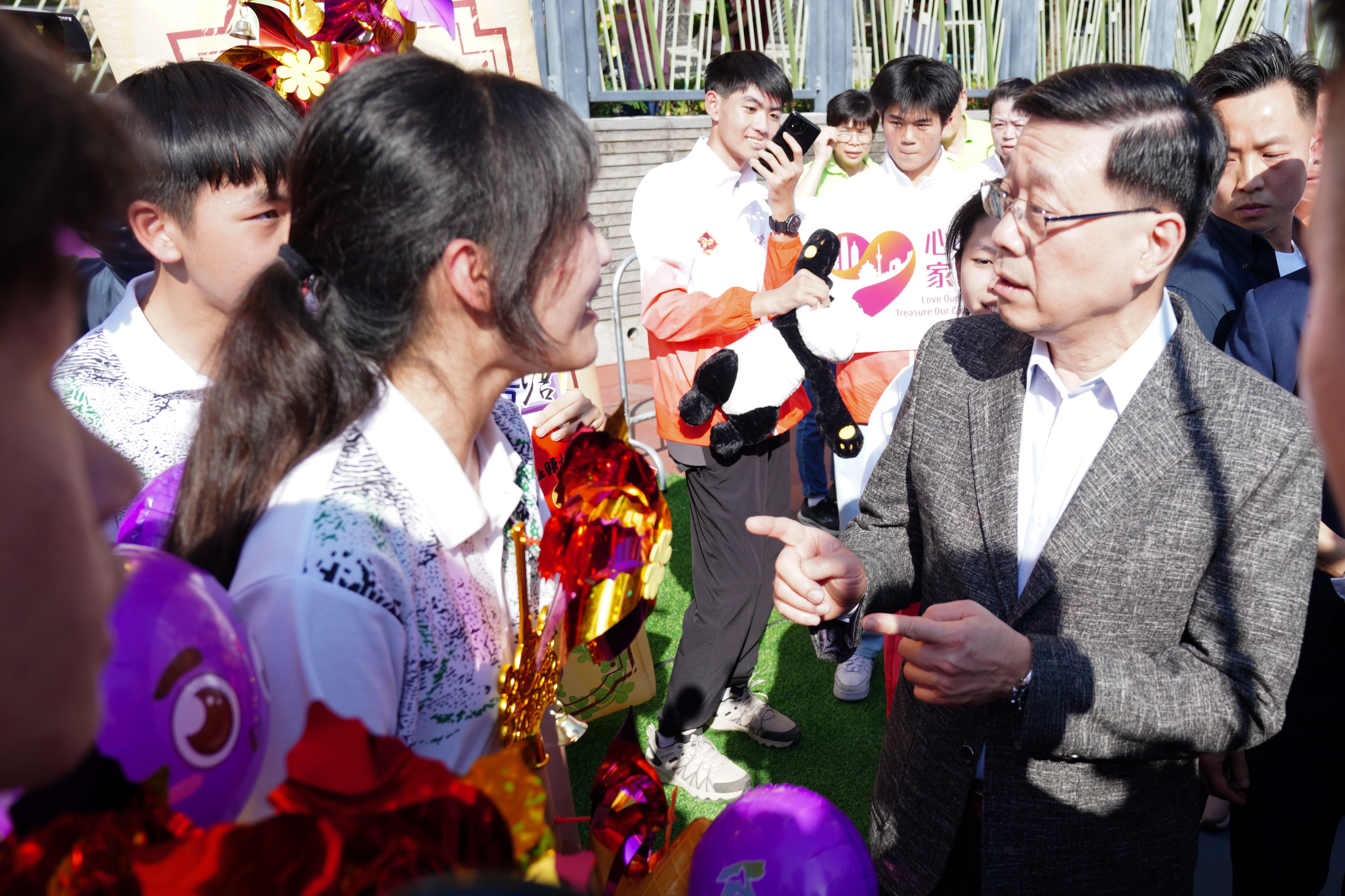李家超隨後參觀了中華基督教基智中學的學生攤檔,對他們的標語「奔騰不息、自強向前」表示欣賞,形容學生們是社會的未來、希望、「新力軍」,鼓勵他們參與民政及青年事務局的青年工作,又與一眾學生和警方吉祥物「提子」合照。
