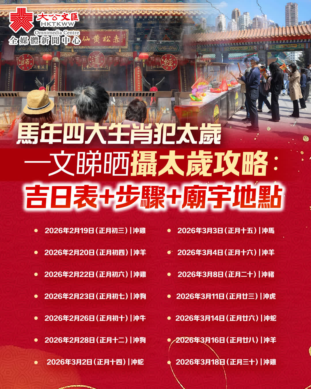 攝太歲應在立春(2026年2月4日)後進行,正月為最佳時間: