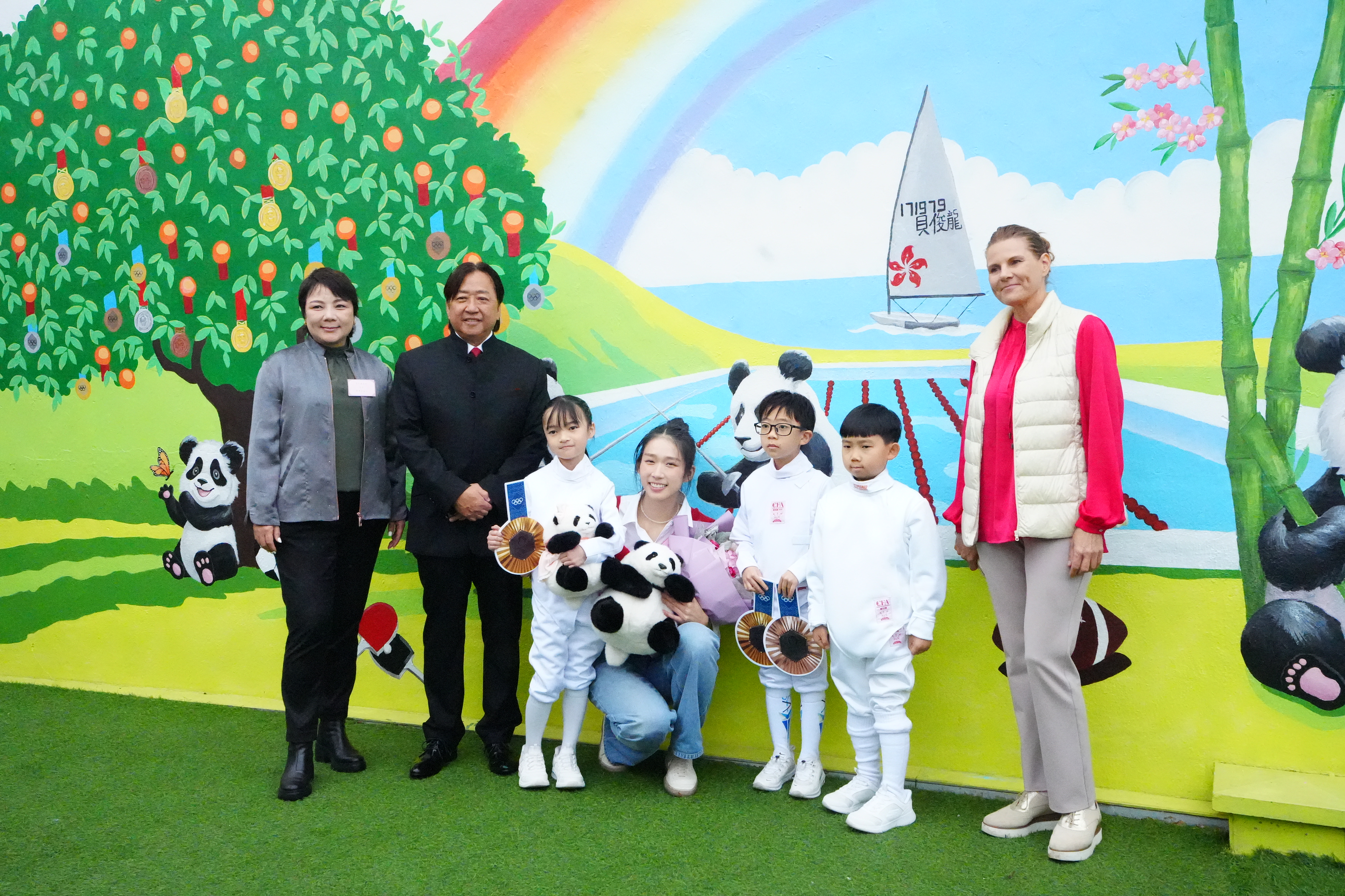 為何主辦單位會邀請江旻憓?皆因林村許願廣場主席鄭倫光配合2024年巴黎奧運熱潮,推出「熊貓壁畫」加強版,將奧運選手以及港隊獲取的獎牌畫入畫作。鄭倫光形容,能請到江旻憓到來,與該畫合照,是願望成真。「劍后」同樣「心情大靚」,和現場小朋友運動員與學生互動拍照,吸引大批市民和旅客一齊打卡。