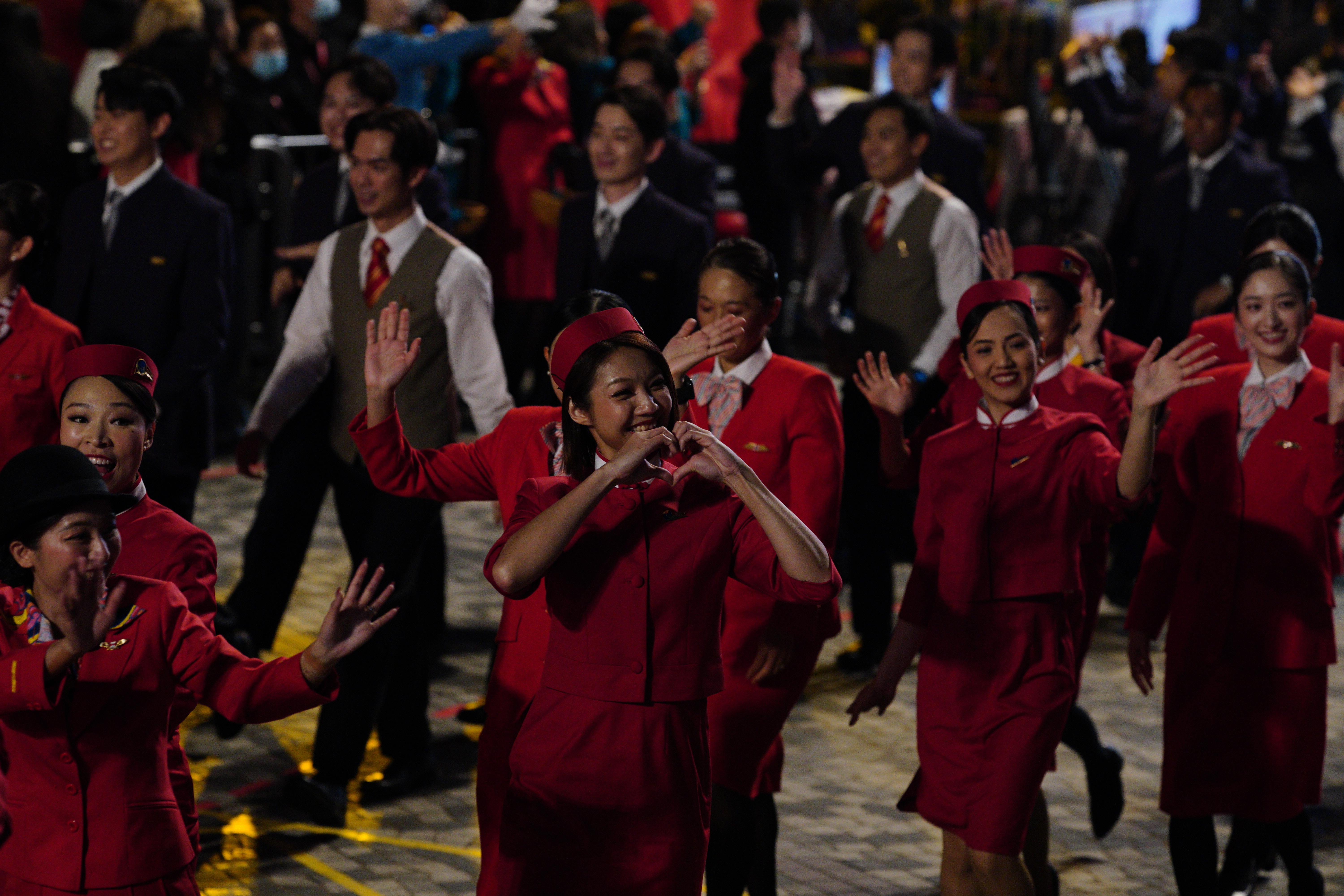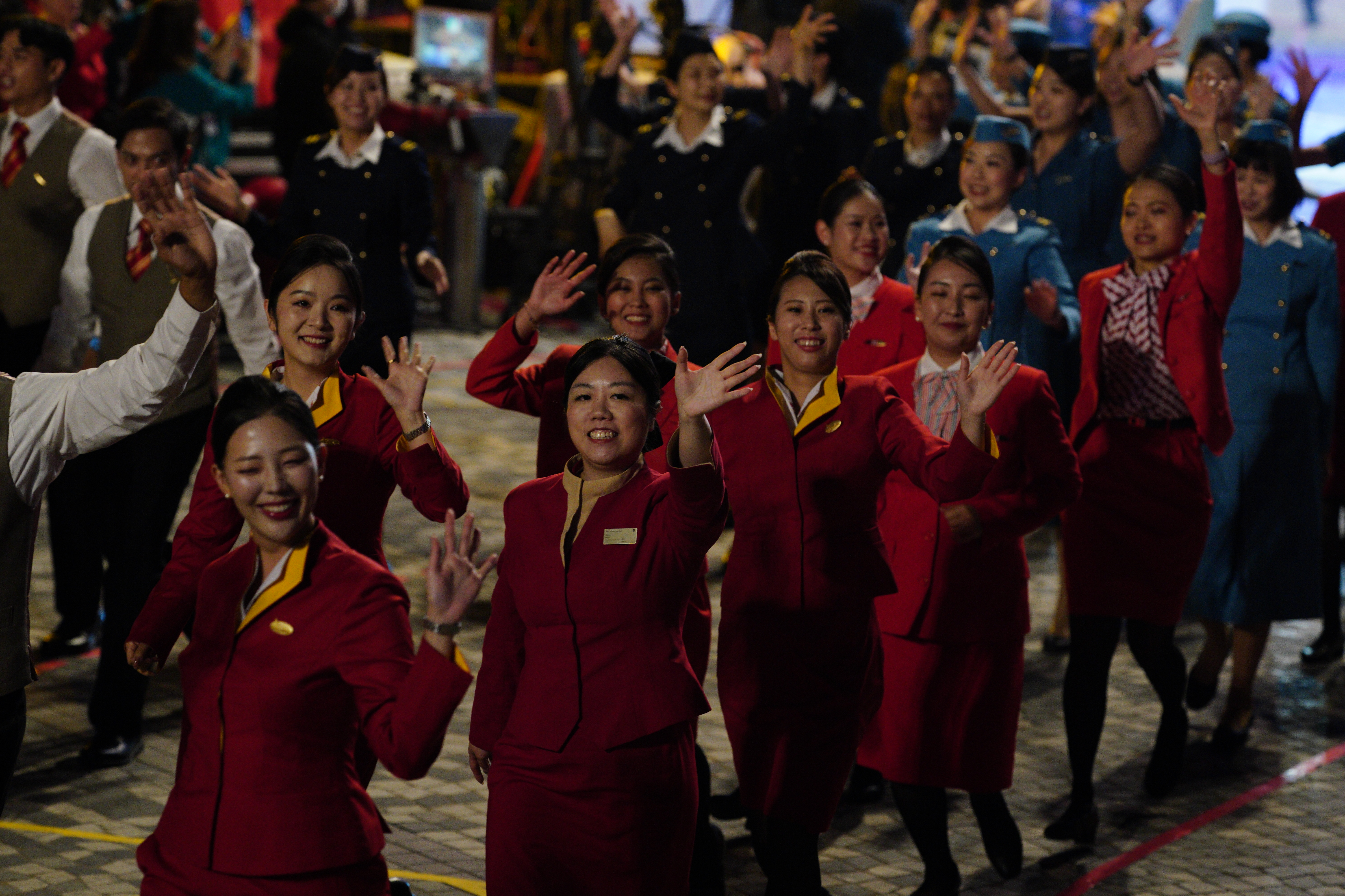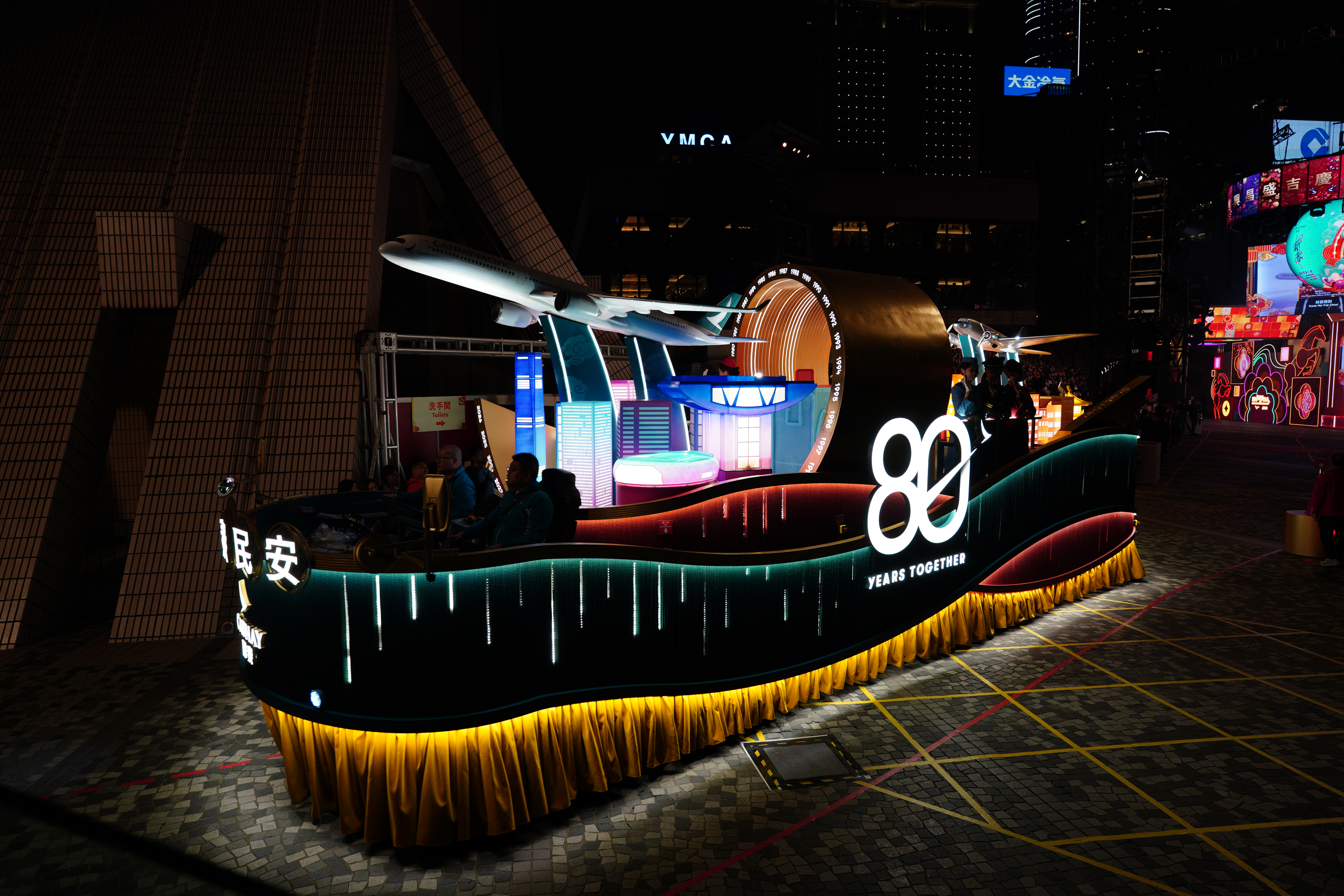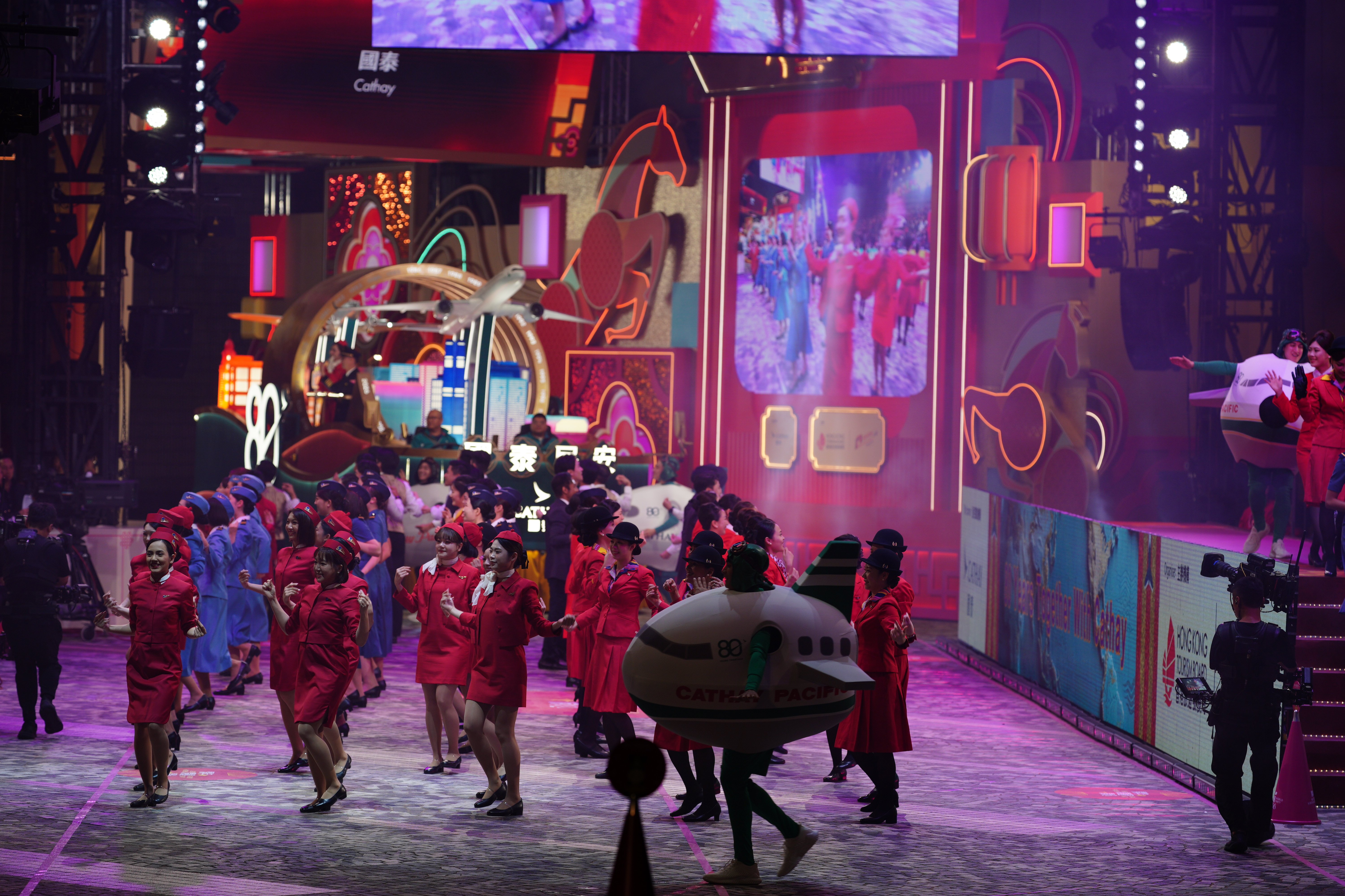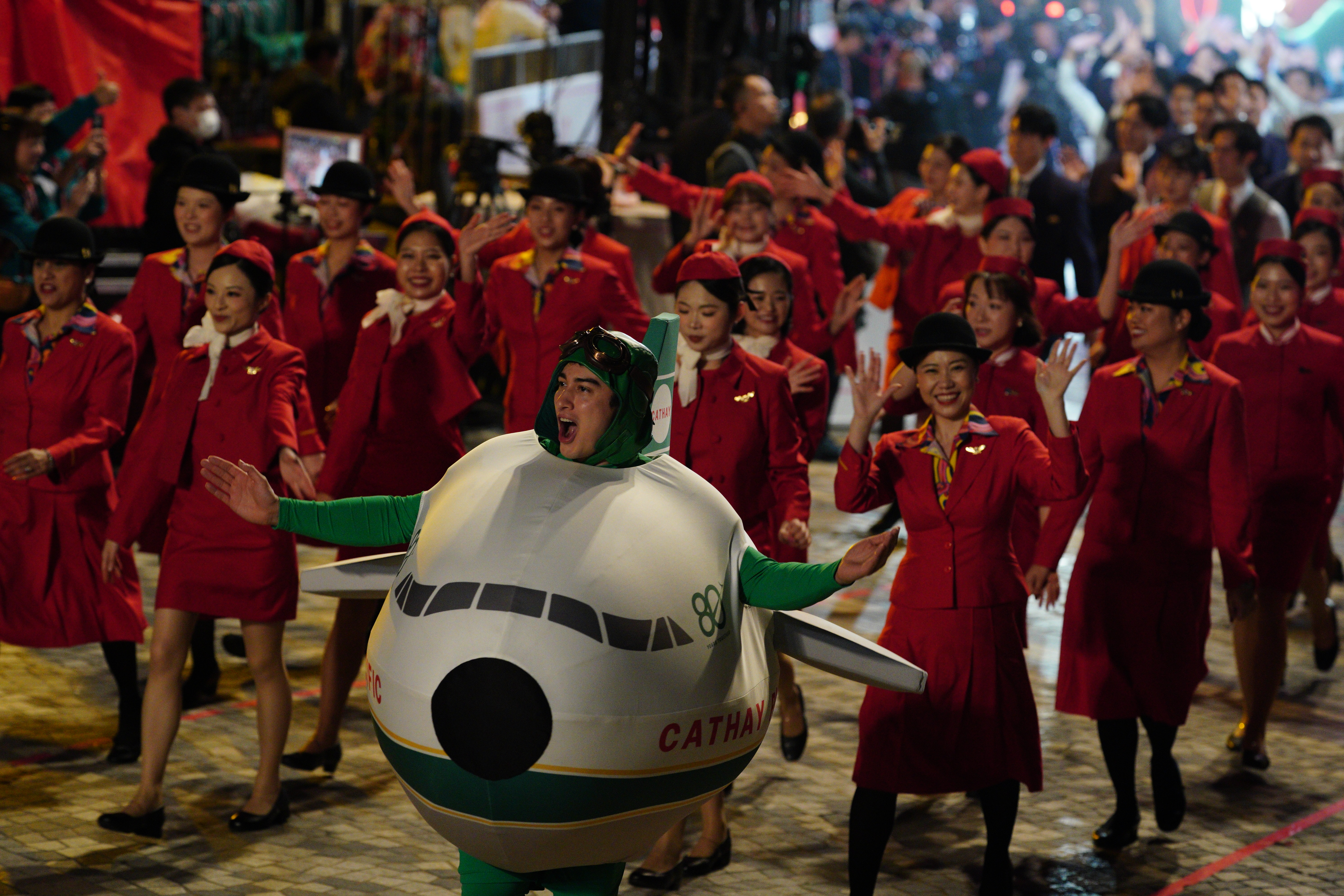 大公文匯全媒體報道,花車巡遊今晚(17日)8時在尖沙咀隆重登場,80位國泰機組和地勤人員組成的巡遊團隊身着不同時期空中制服,在音樂串燒下大跳勁舞。隨後,「國泰同心飛躍八十年」主題花車率先出發,花車上有「80 YEARS TOGETHER」文字,外形設計則包涵了大量國泰經典元素,其兩款客機在「時空隧道」下穿越時光,寓意國泰與香港共同走過的80年旅程。