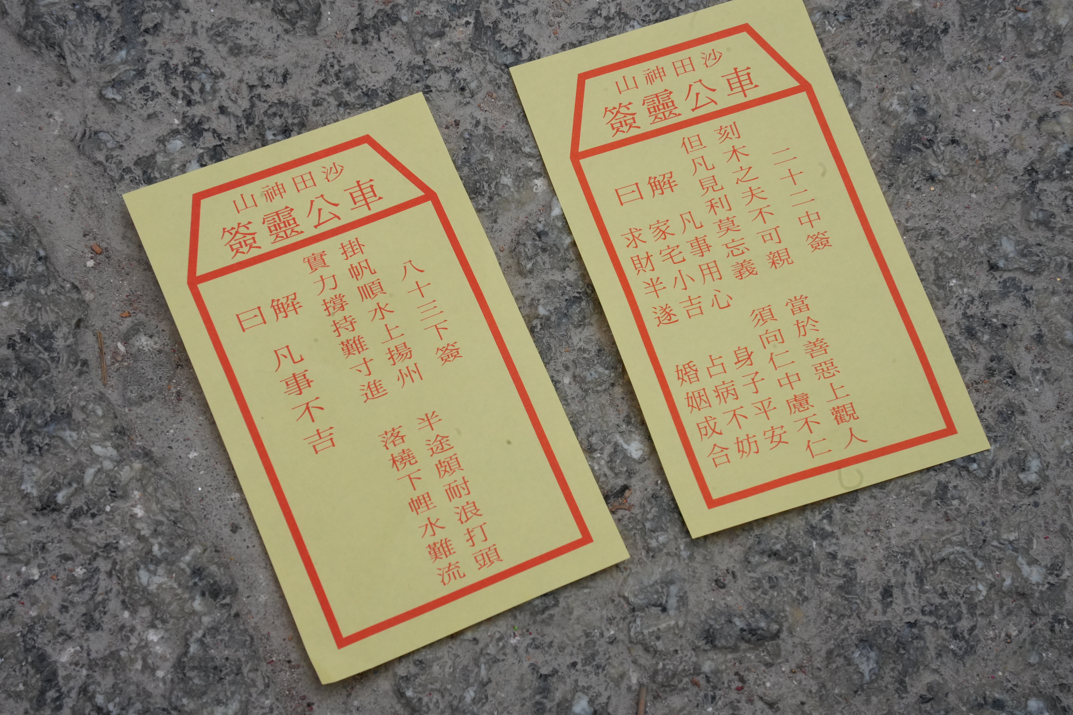 今日(18日)早上8時,鄉議局成員在車公廟內,行上香禮,朝拜、獻三牲等儀式,鄉議局主席劉業強拿起籤筒,為香港求得第22籤,中籤,籤文為:「刻木之夫不可親,當於善惡上觀人;但凡見利莫忘義,須向仁中慮不仁。」。解曰:「凡事用心,身子平安,家宅小吉,占病不妨,求財半遂,婚姻成合」。